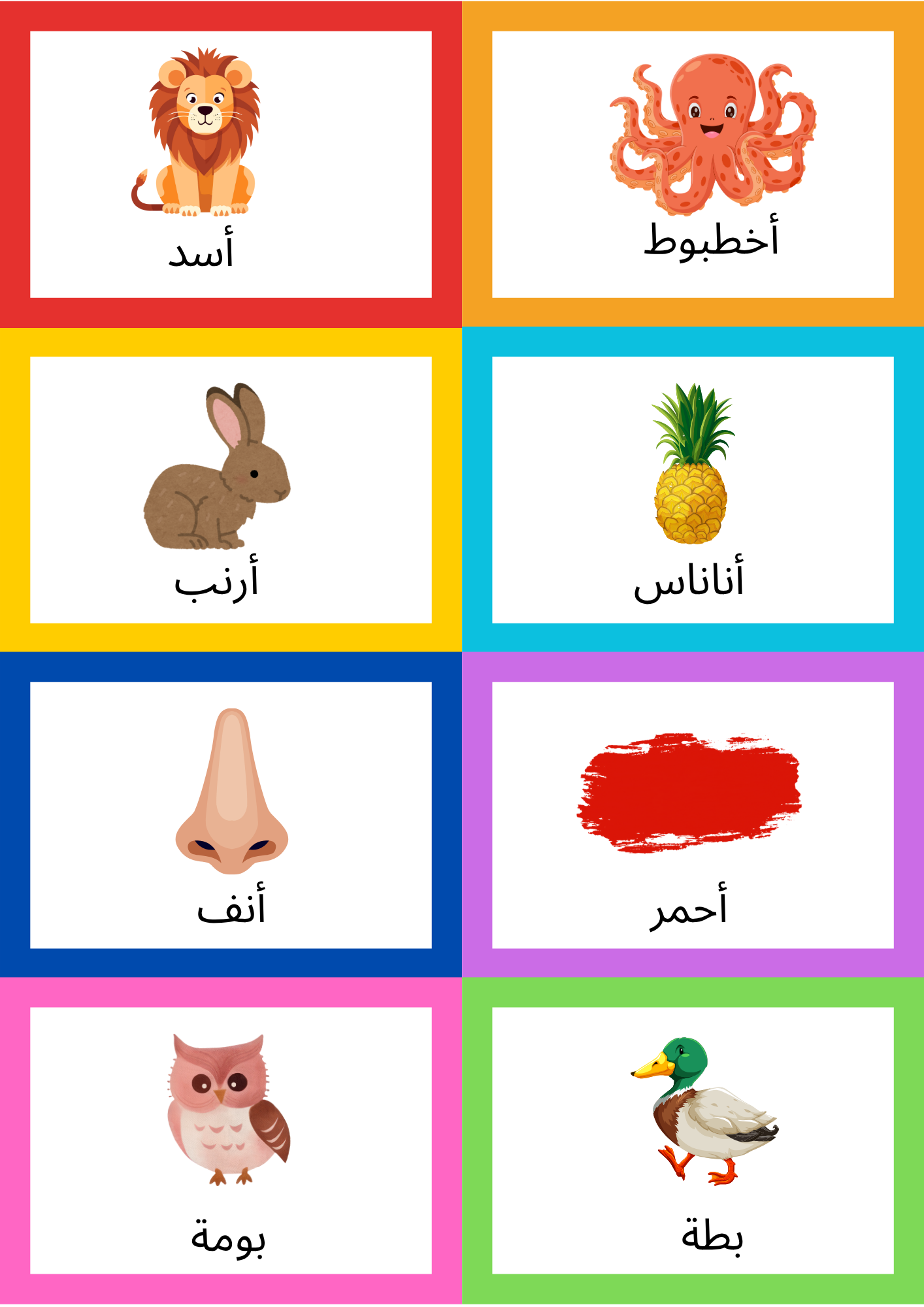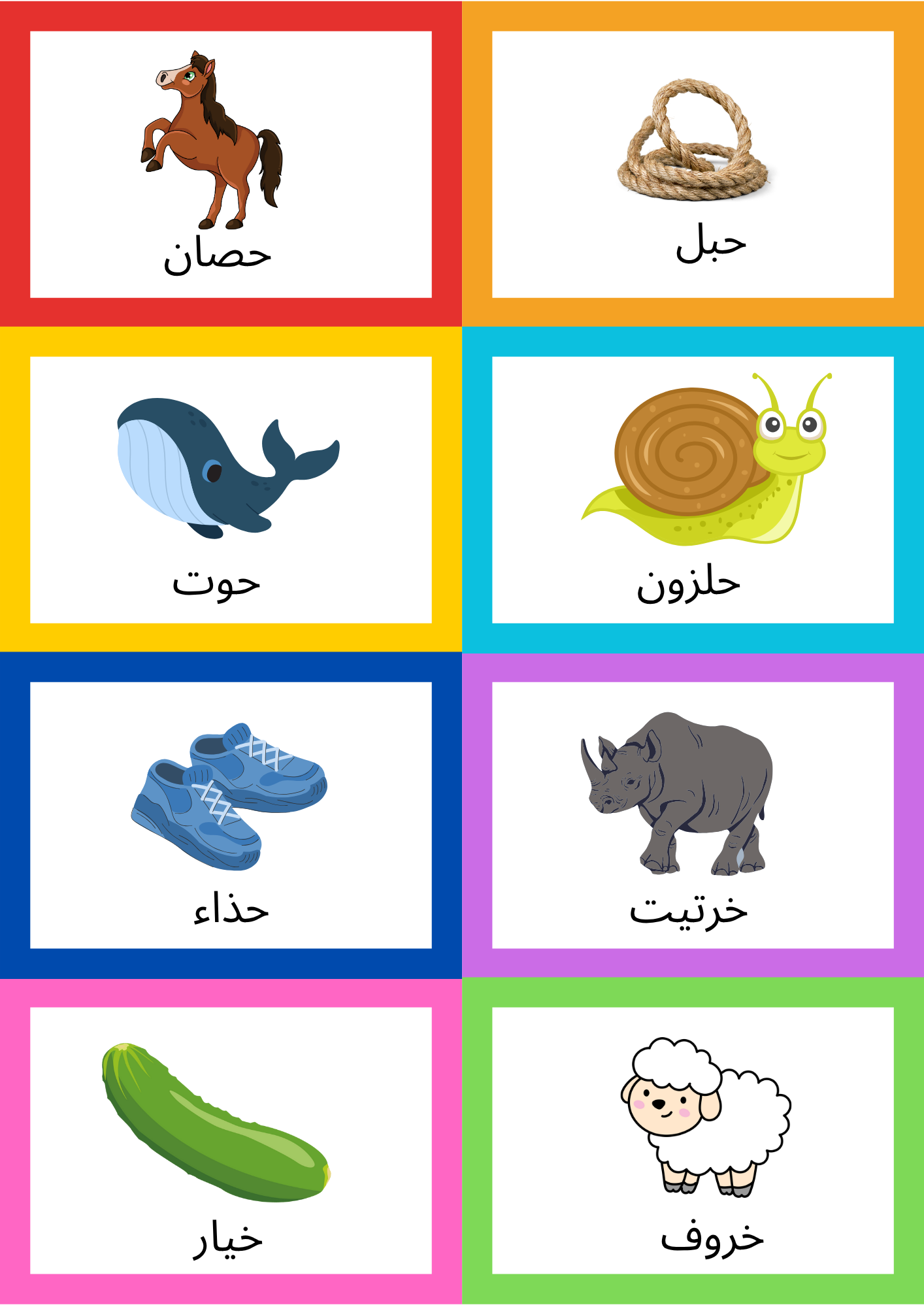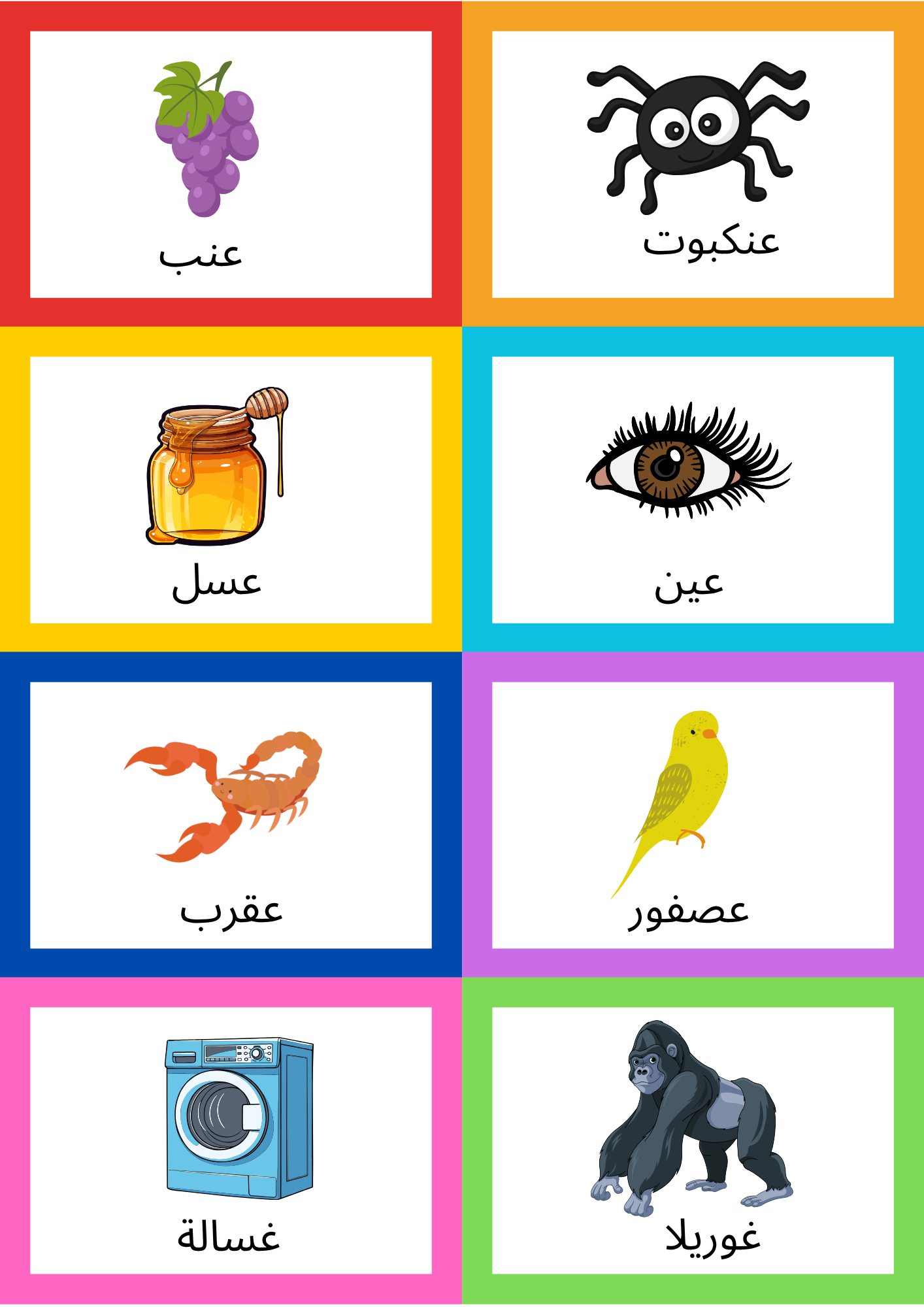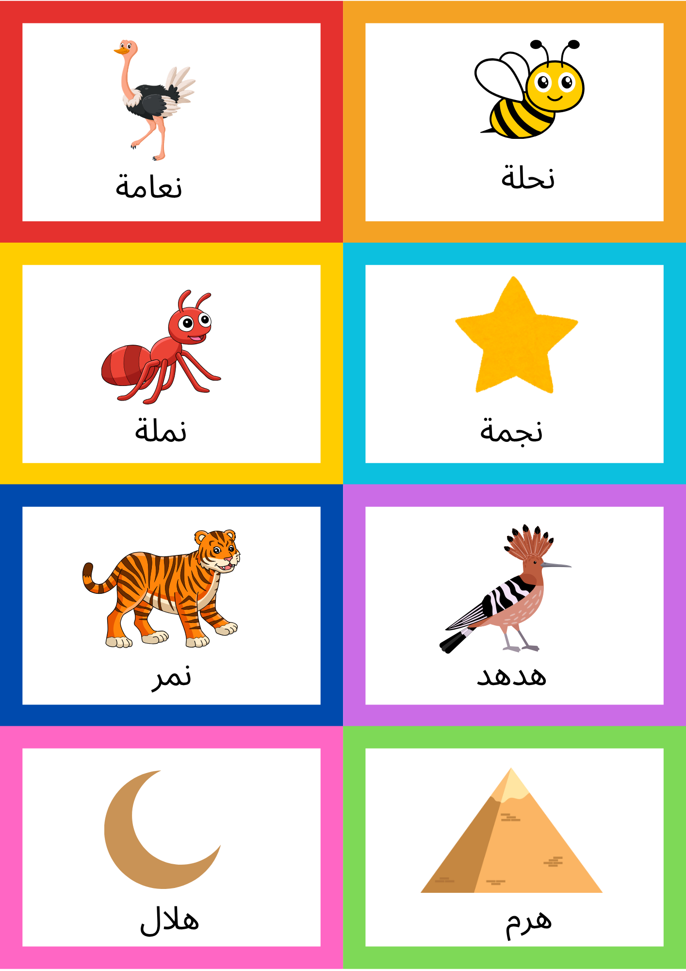 بطاقات تعليمية لتوسيع مفردات الطفل وتعزيز وعيه بأصوات الحروف العربية بطريقة تفاعلية وممتعة.