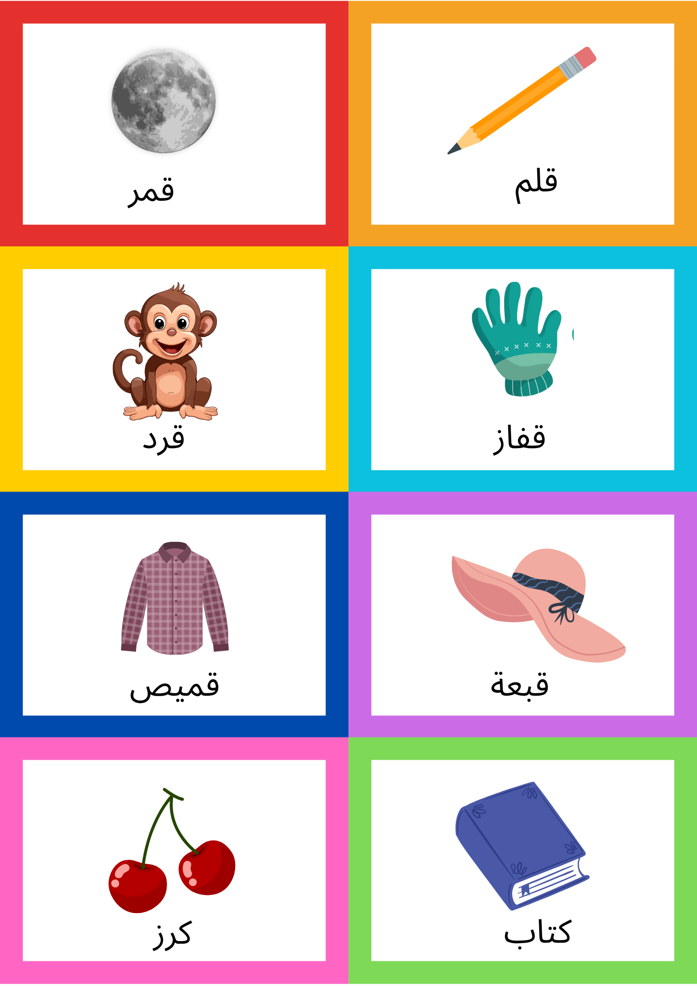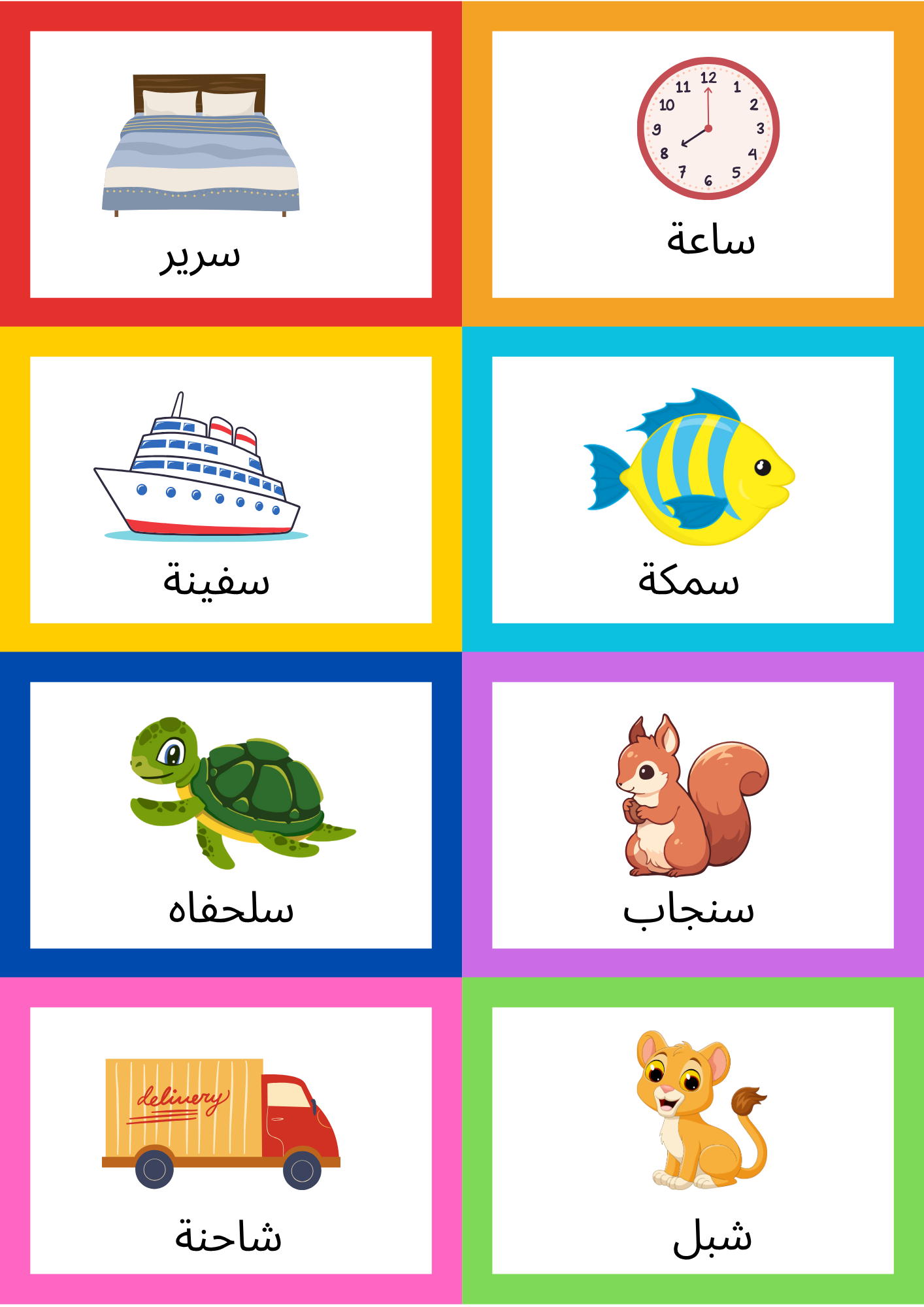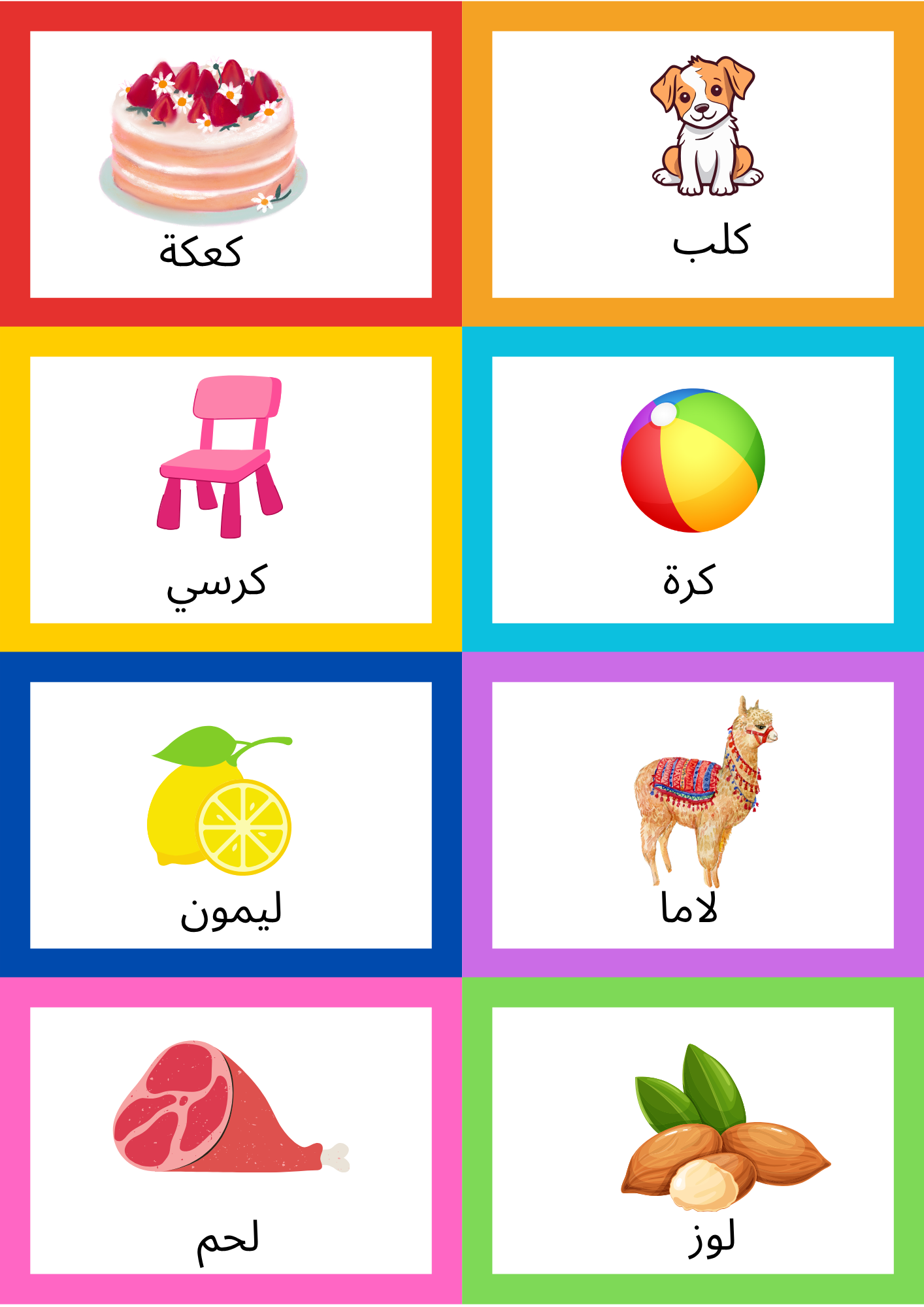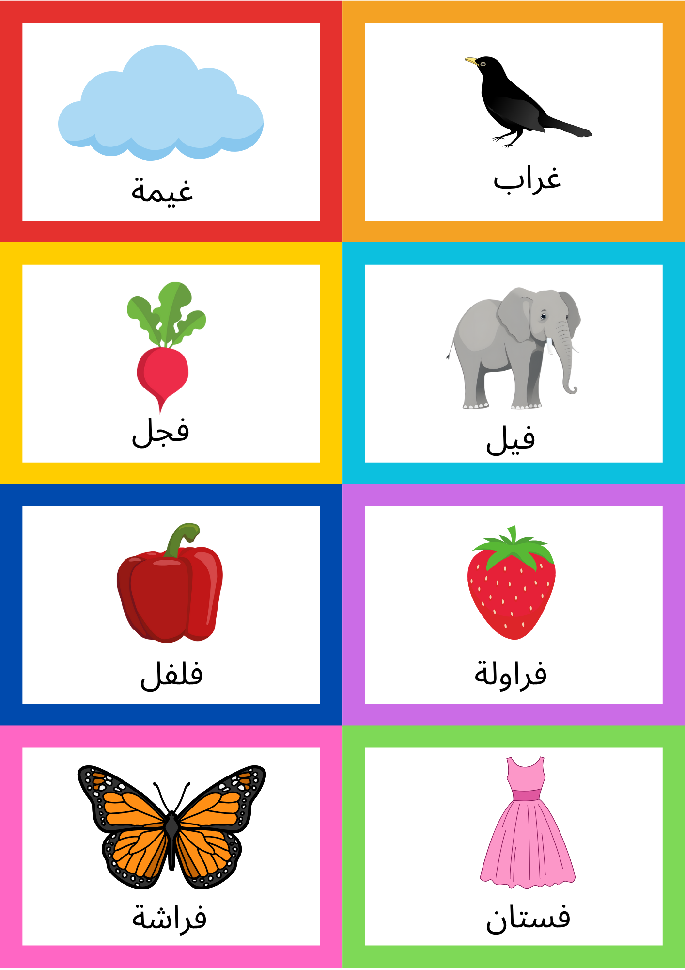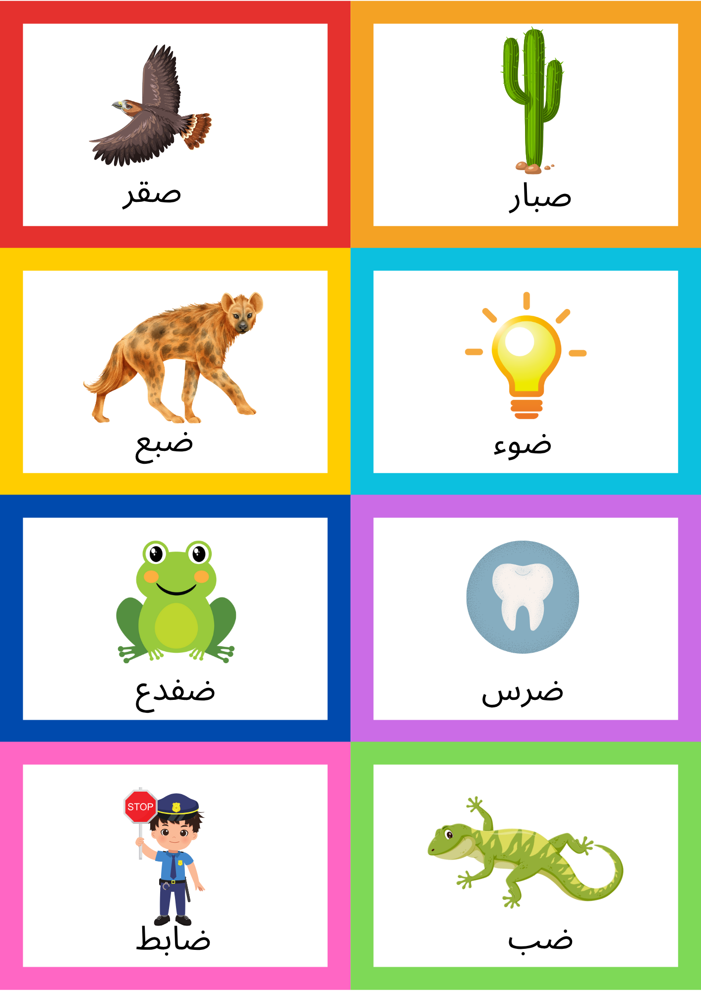 بطاقات تعليمية لتوسيع مفردات الطفل وتعزيز وعيه بأصوات الحروف العربية بطريقة تفاعلية وممتعة.