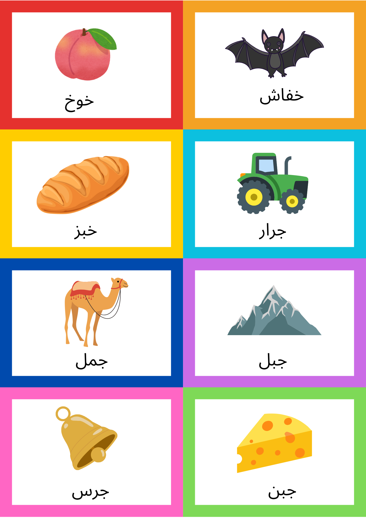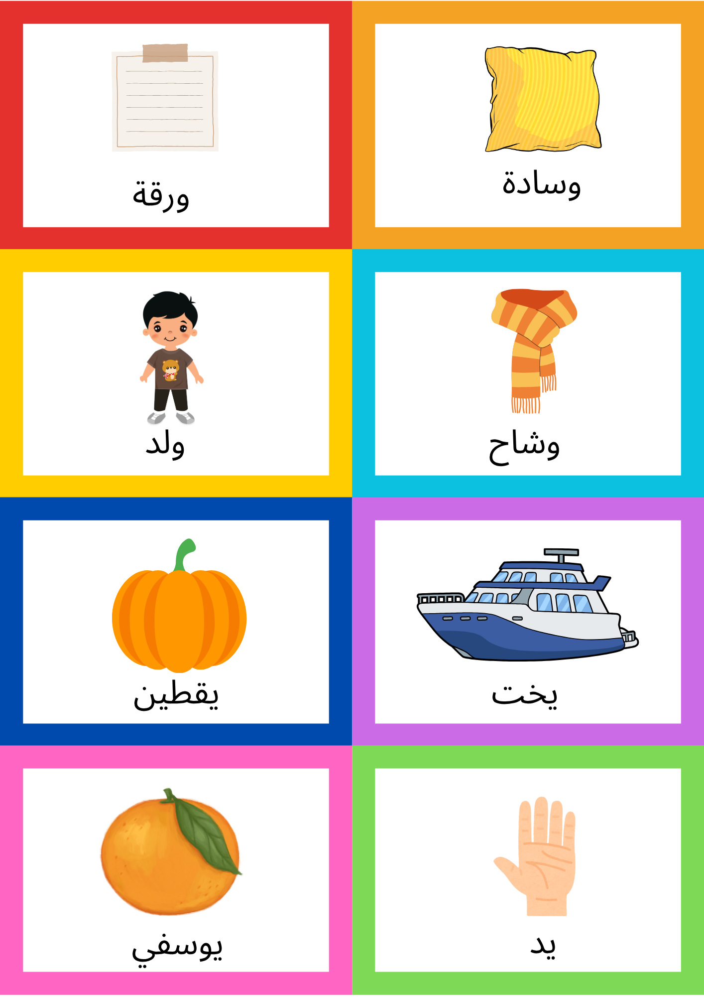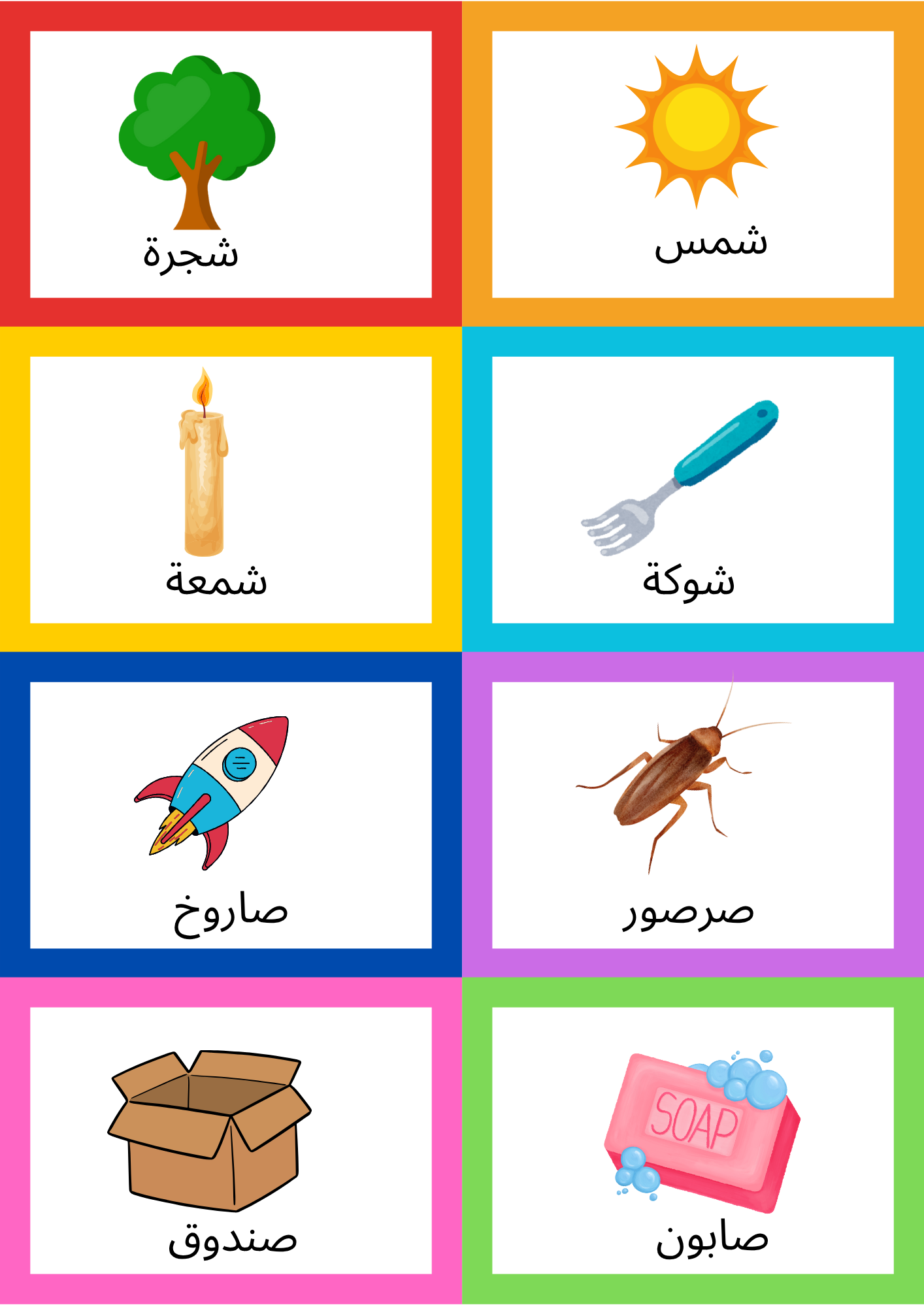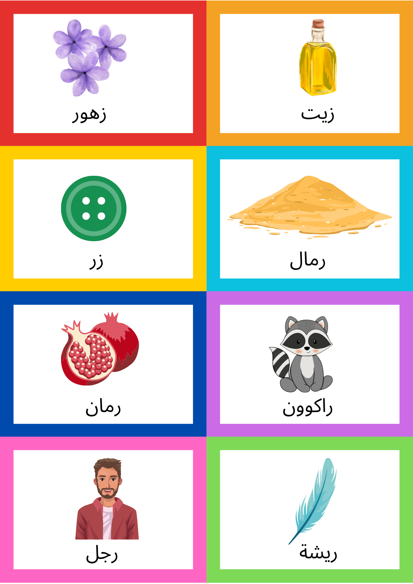 بطاقات تعليمية لتوسيع مفردات الطفل وتعزيز وعيه بأصوات الحروف العربية بطريقة تفاعلية وممتعة.