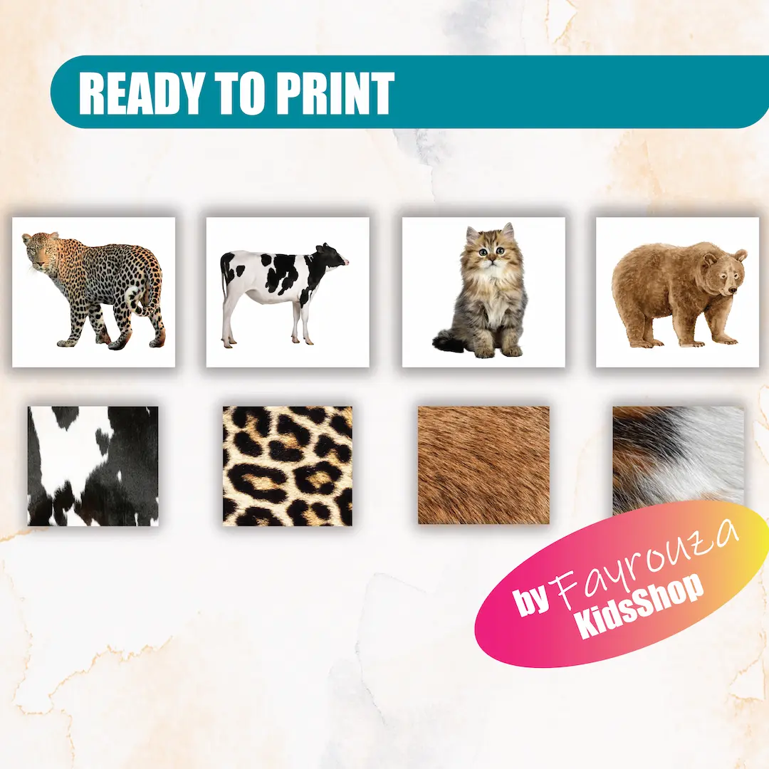🐾 A set of small circular cards, each showing a close-up section of an animal’s fur, feathers, or scales.