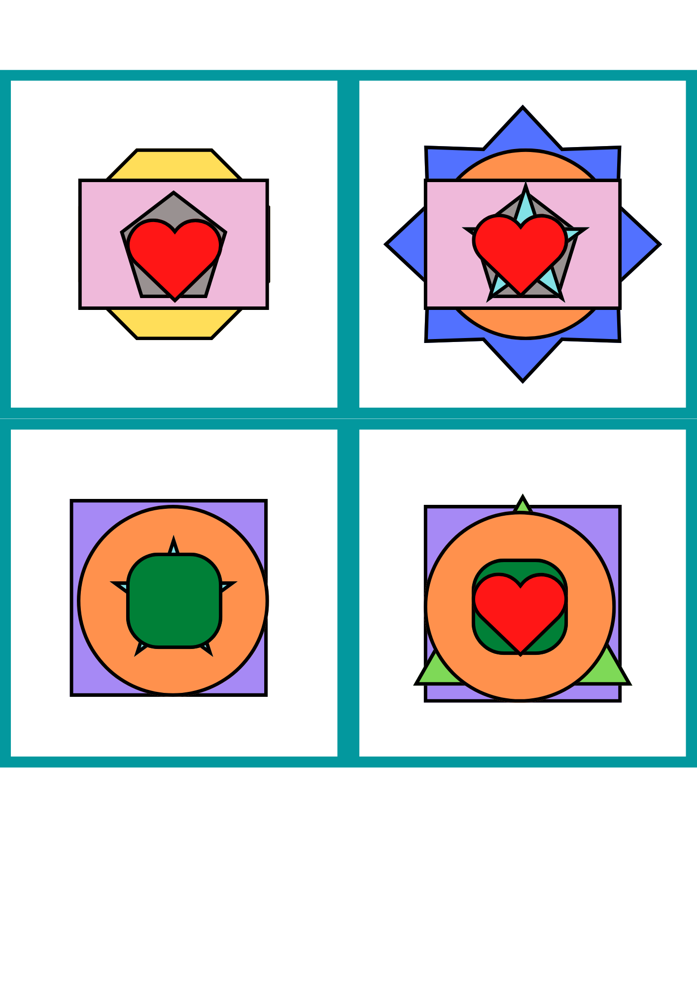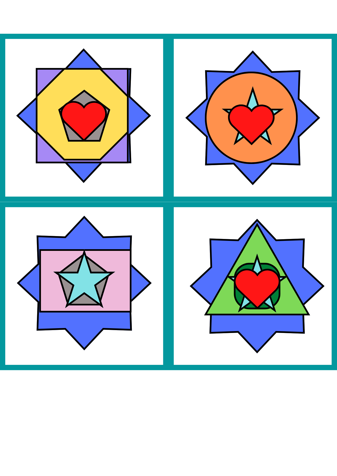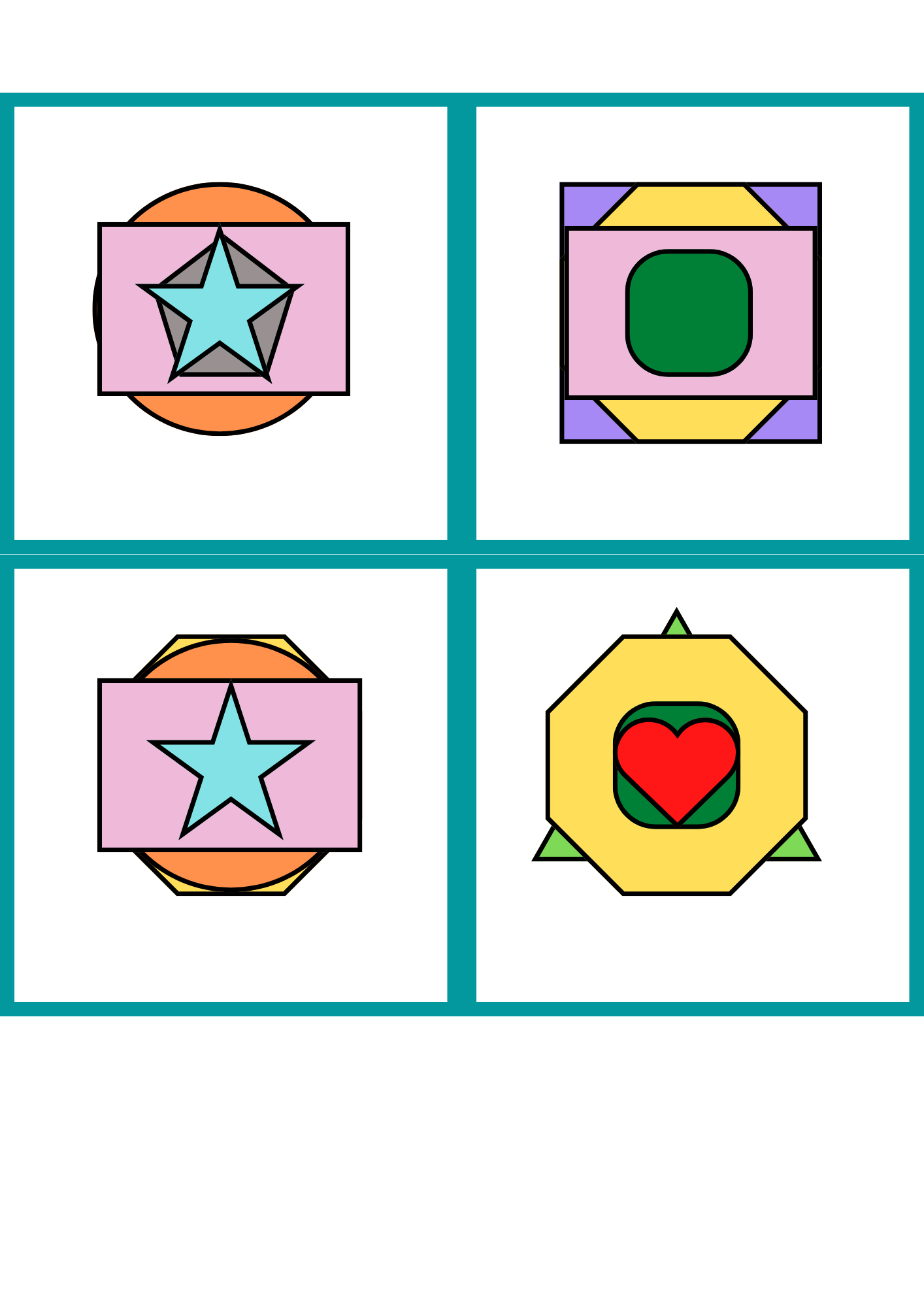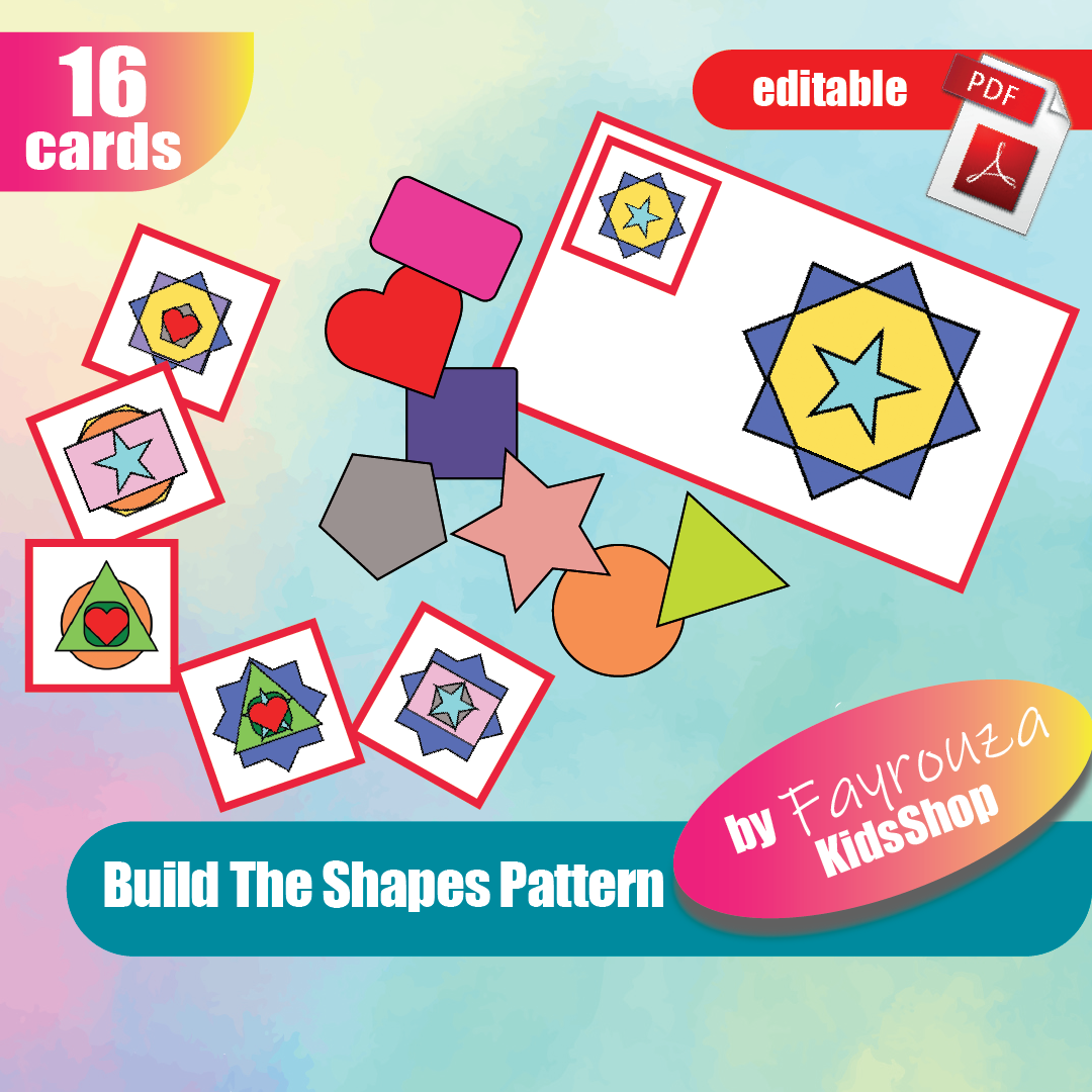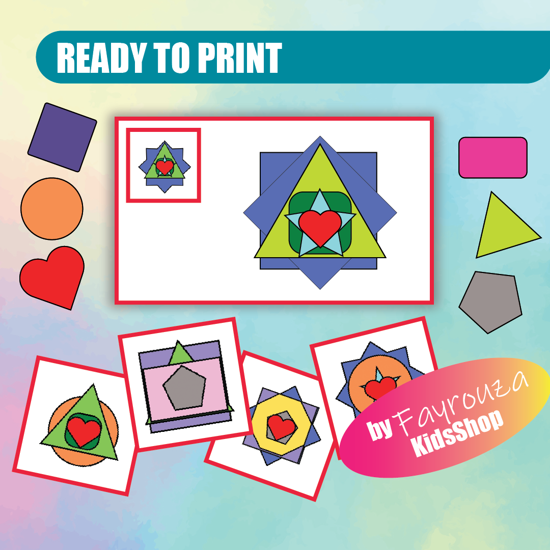 - A set of cards, each showing a specific pattern or design made using these shapes.