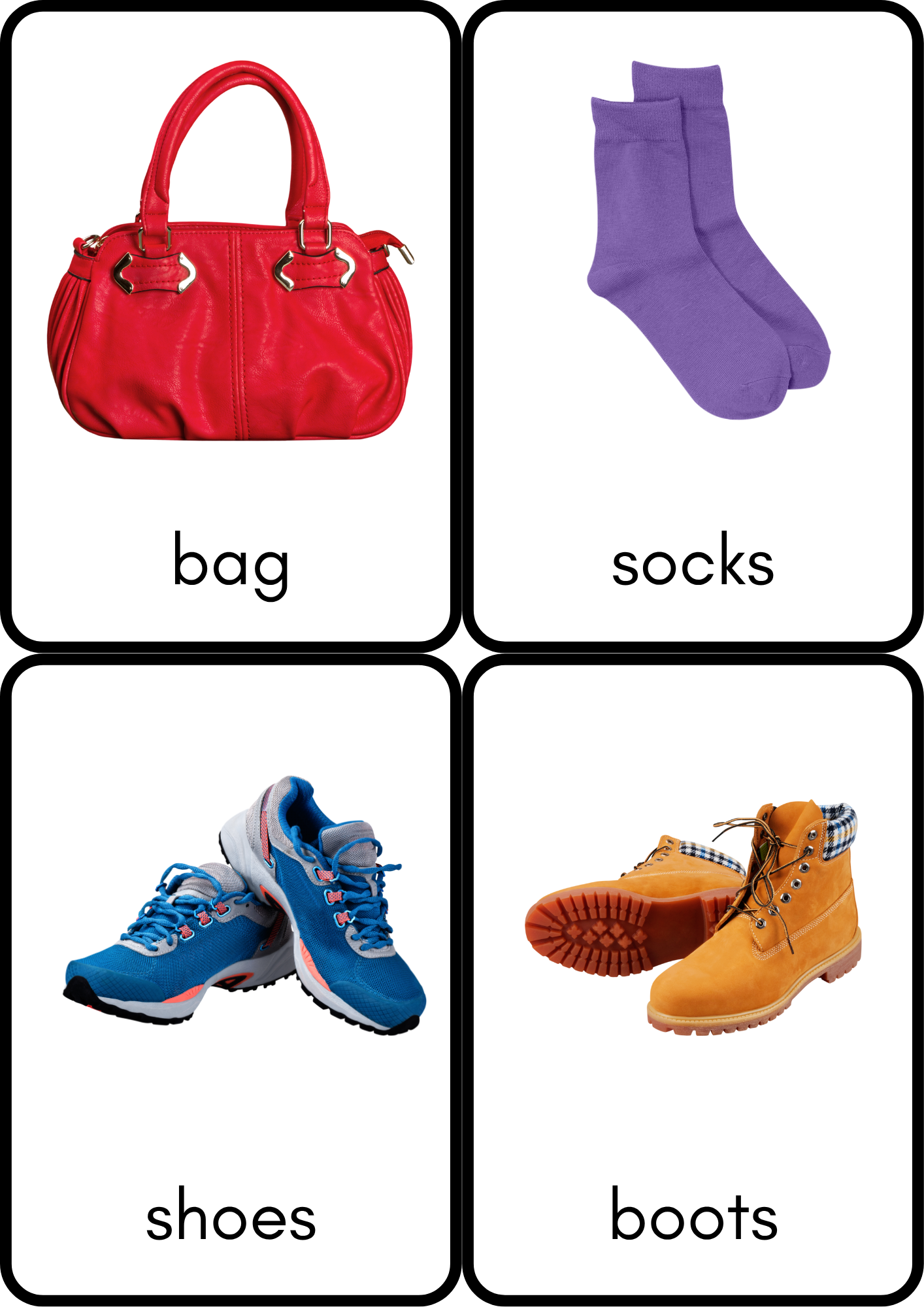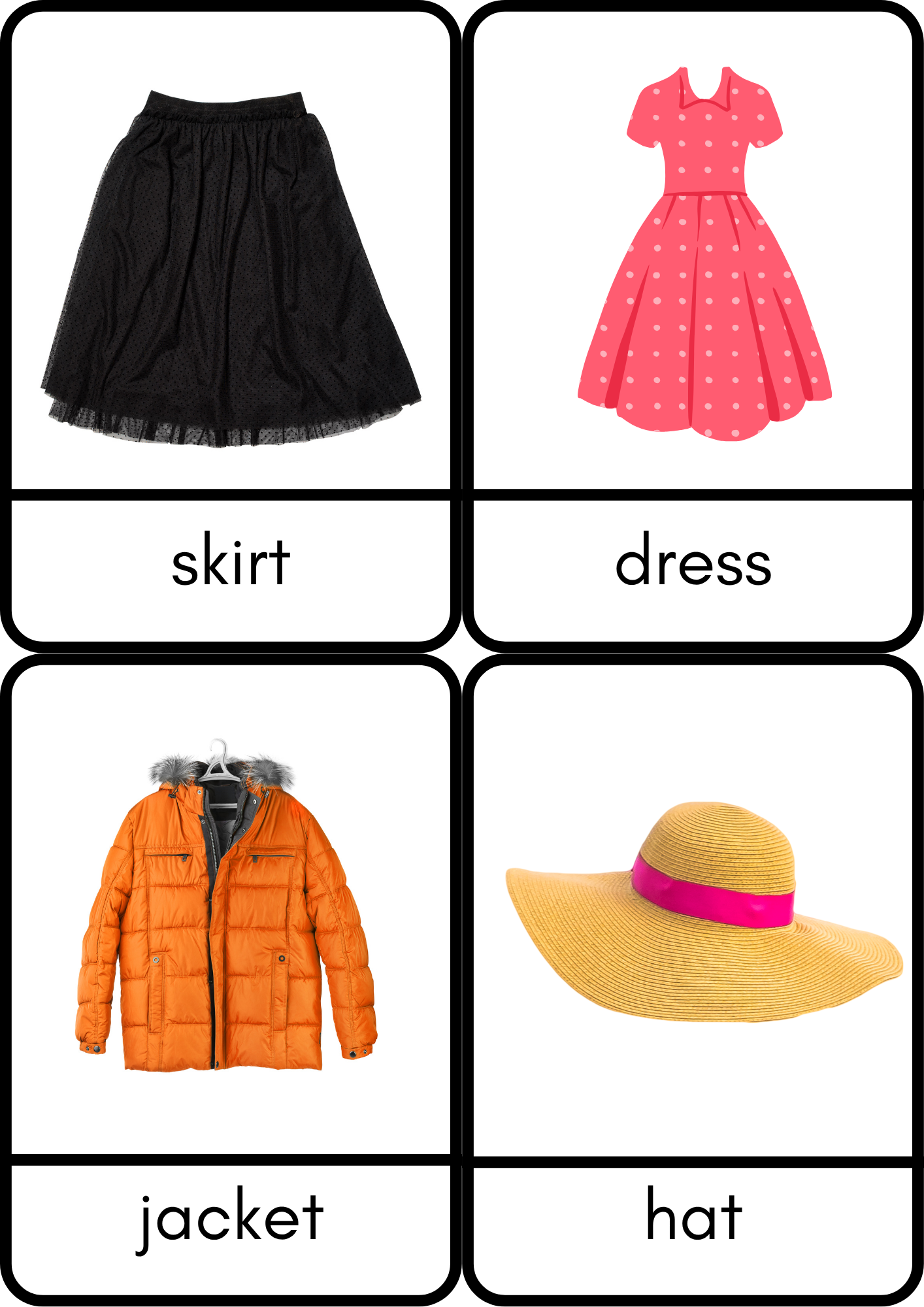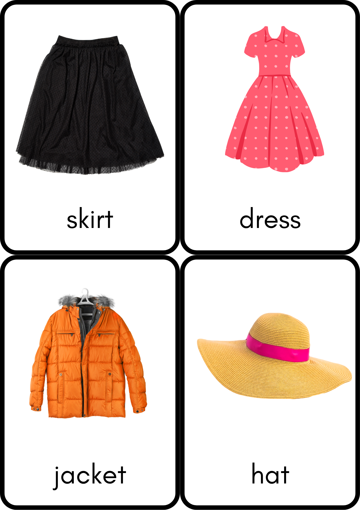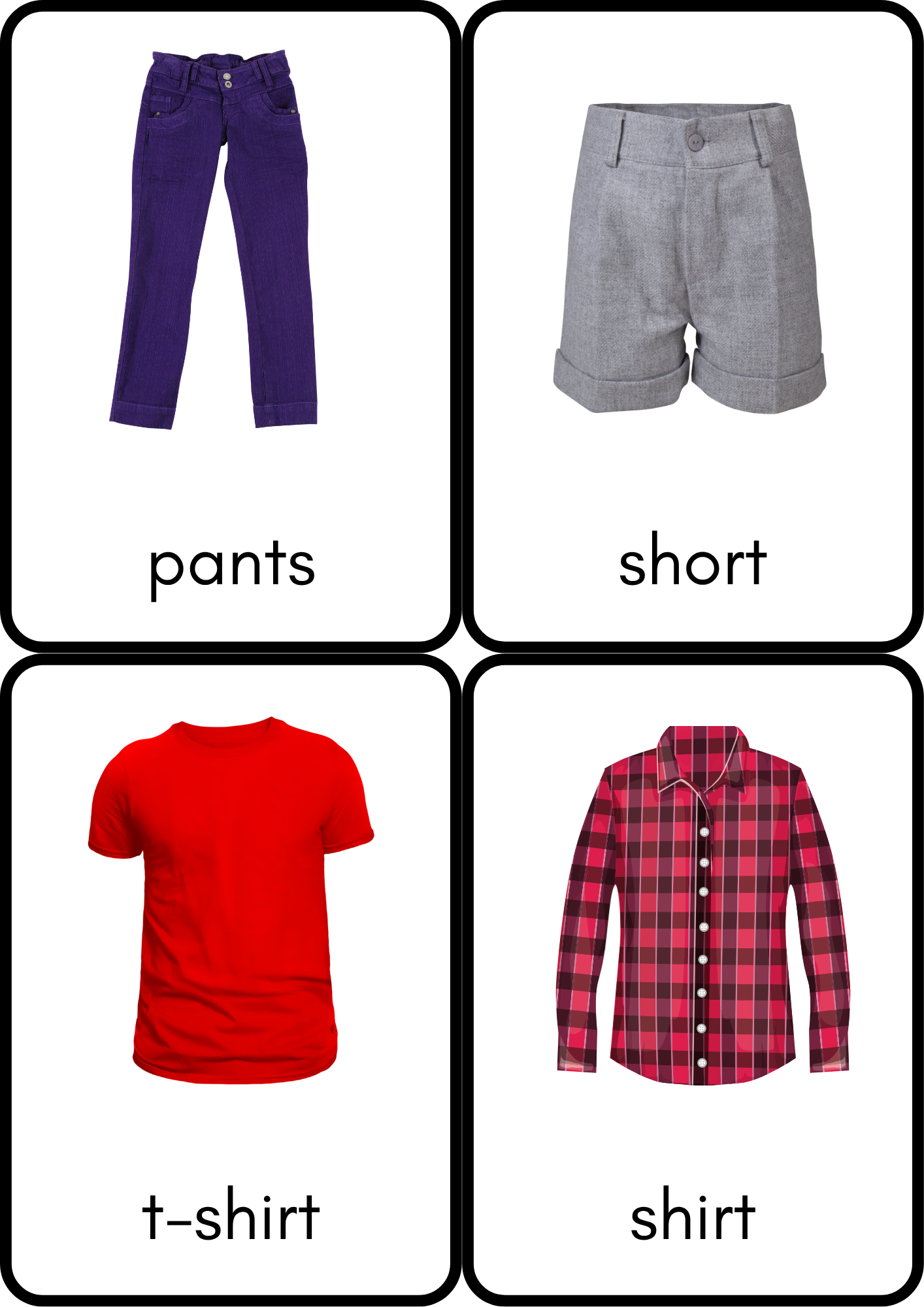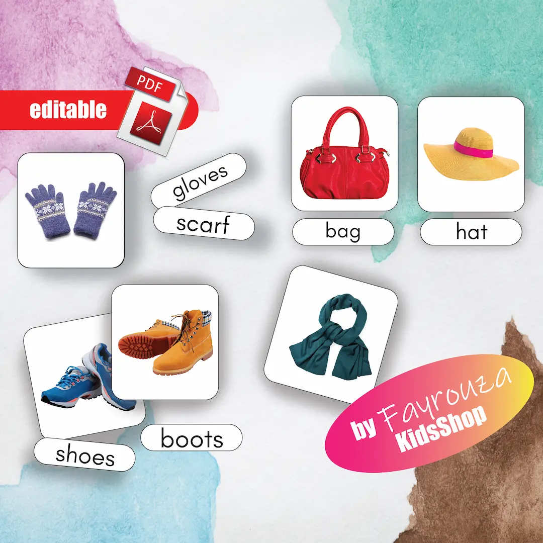 This educational set is designed to help children learn the names of different types of clothing in a fun and interactive way.