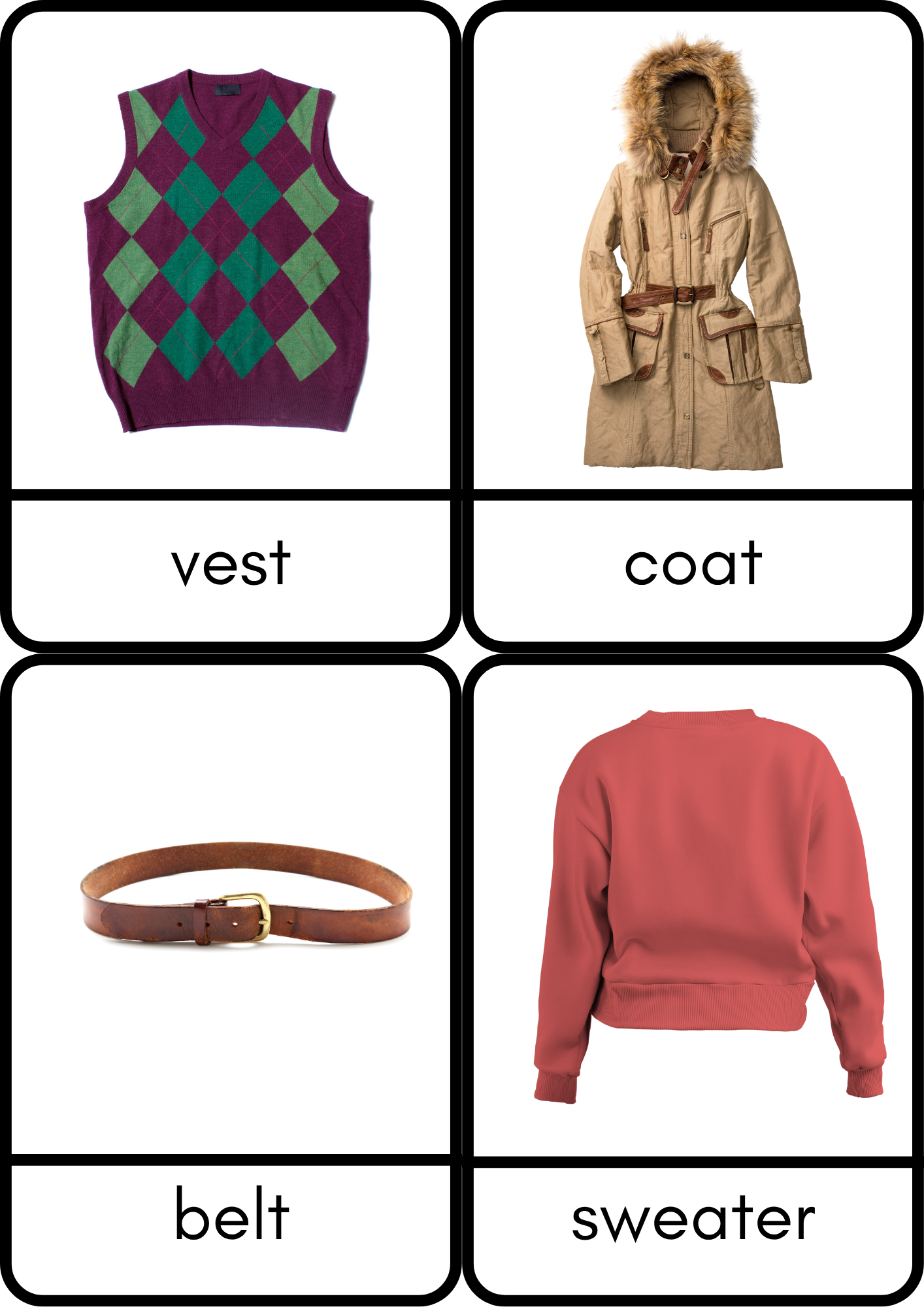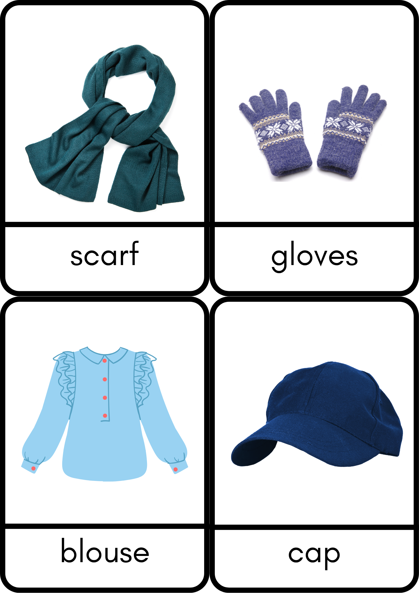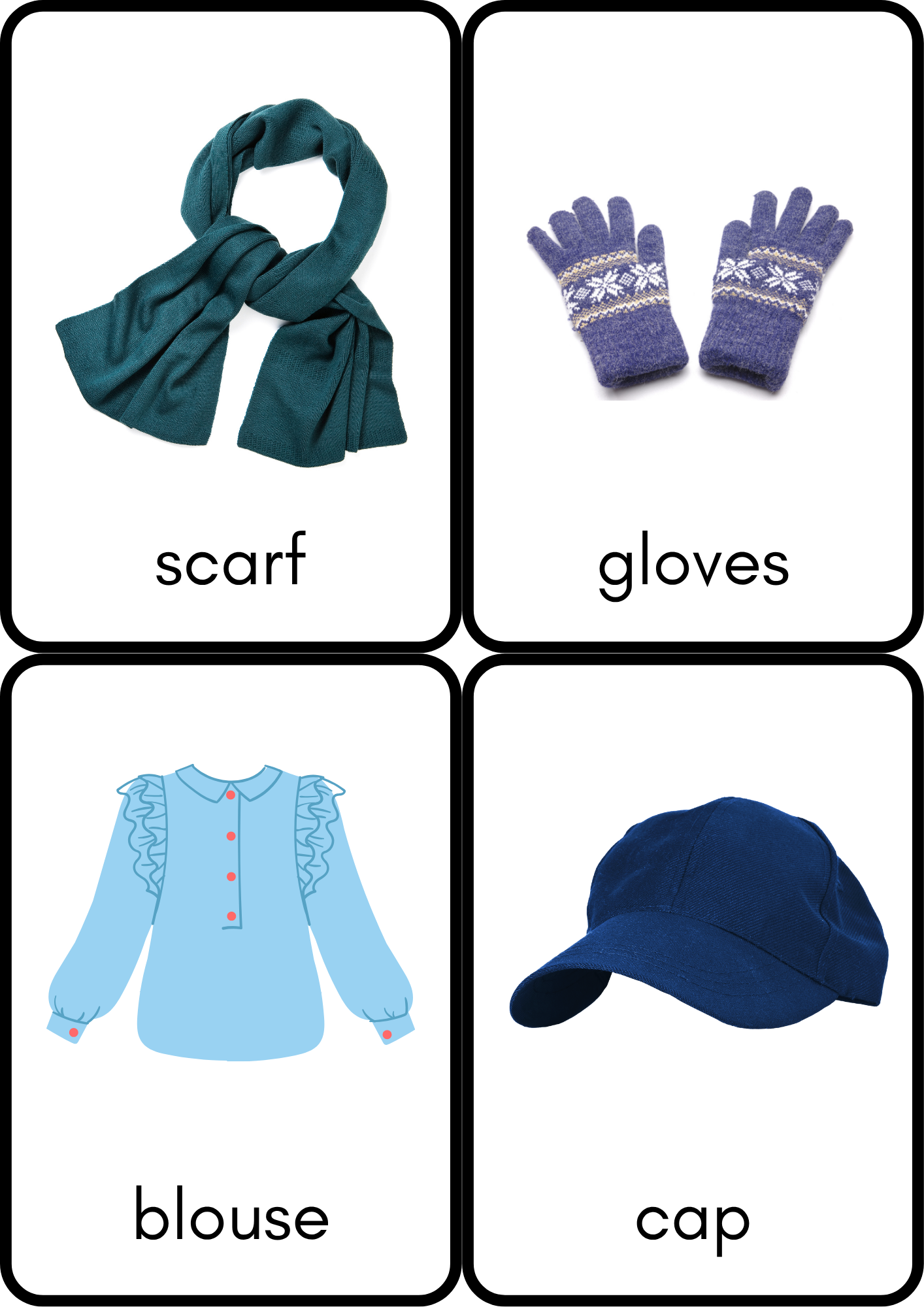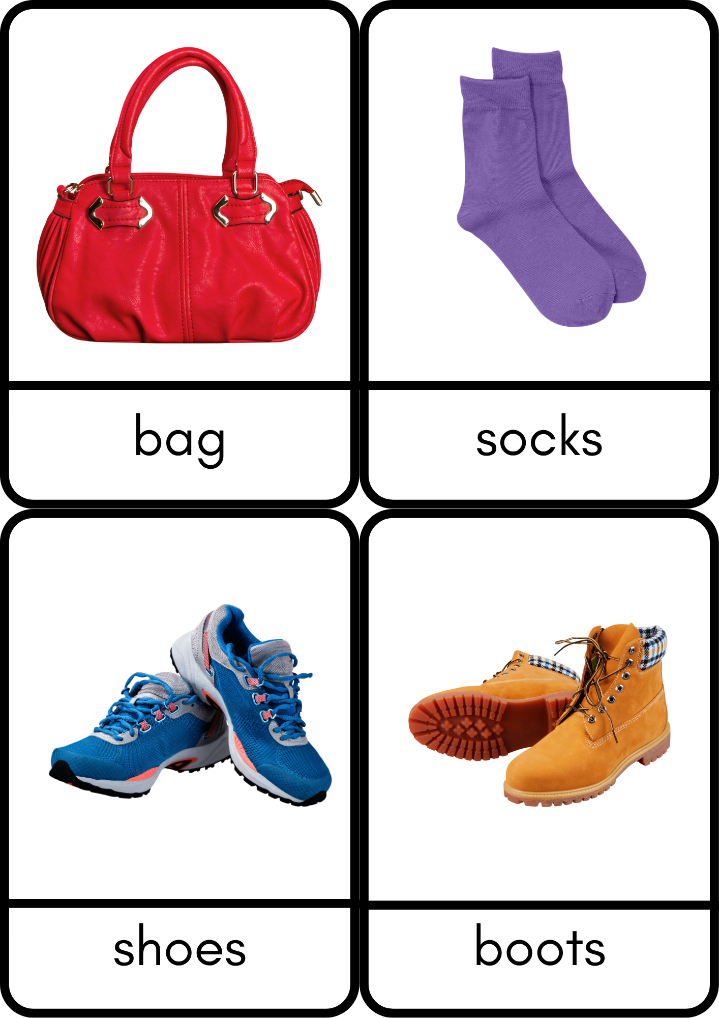 This educational set is designed to help children learn the names of different types of clothing in a fun and interactive way.