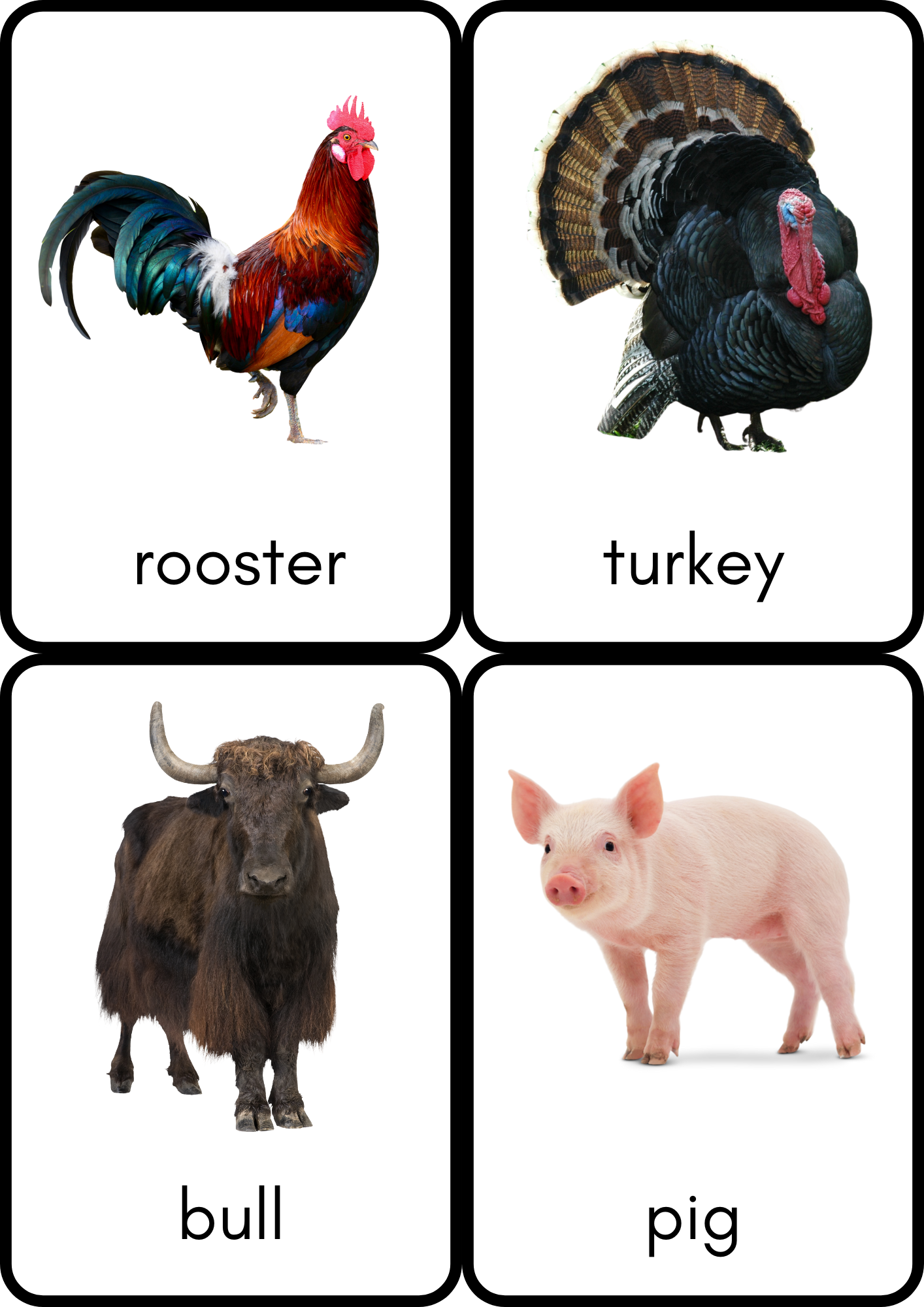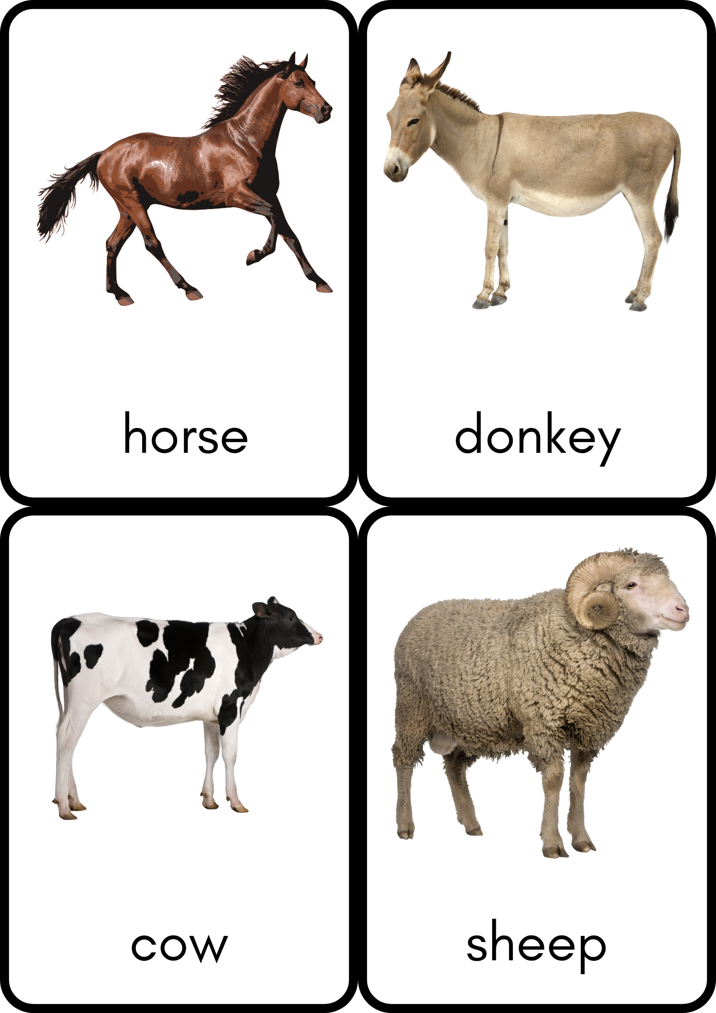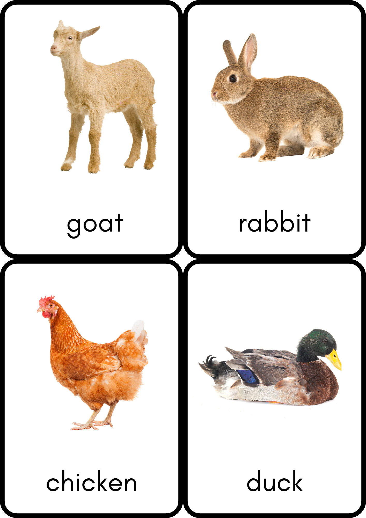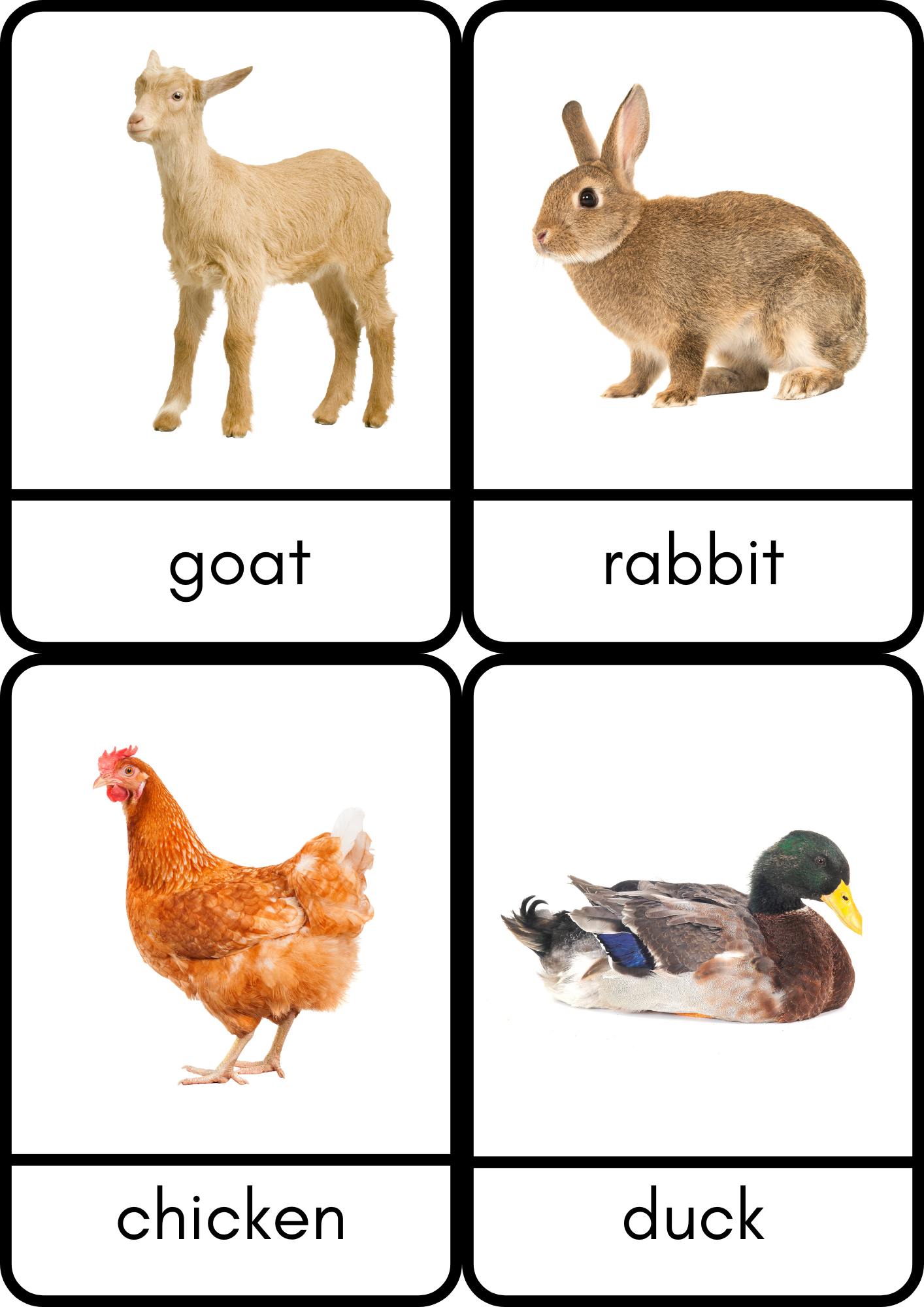 Main card: A card with a picture of a farm animal and its name written clearly underneath.
