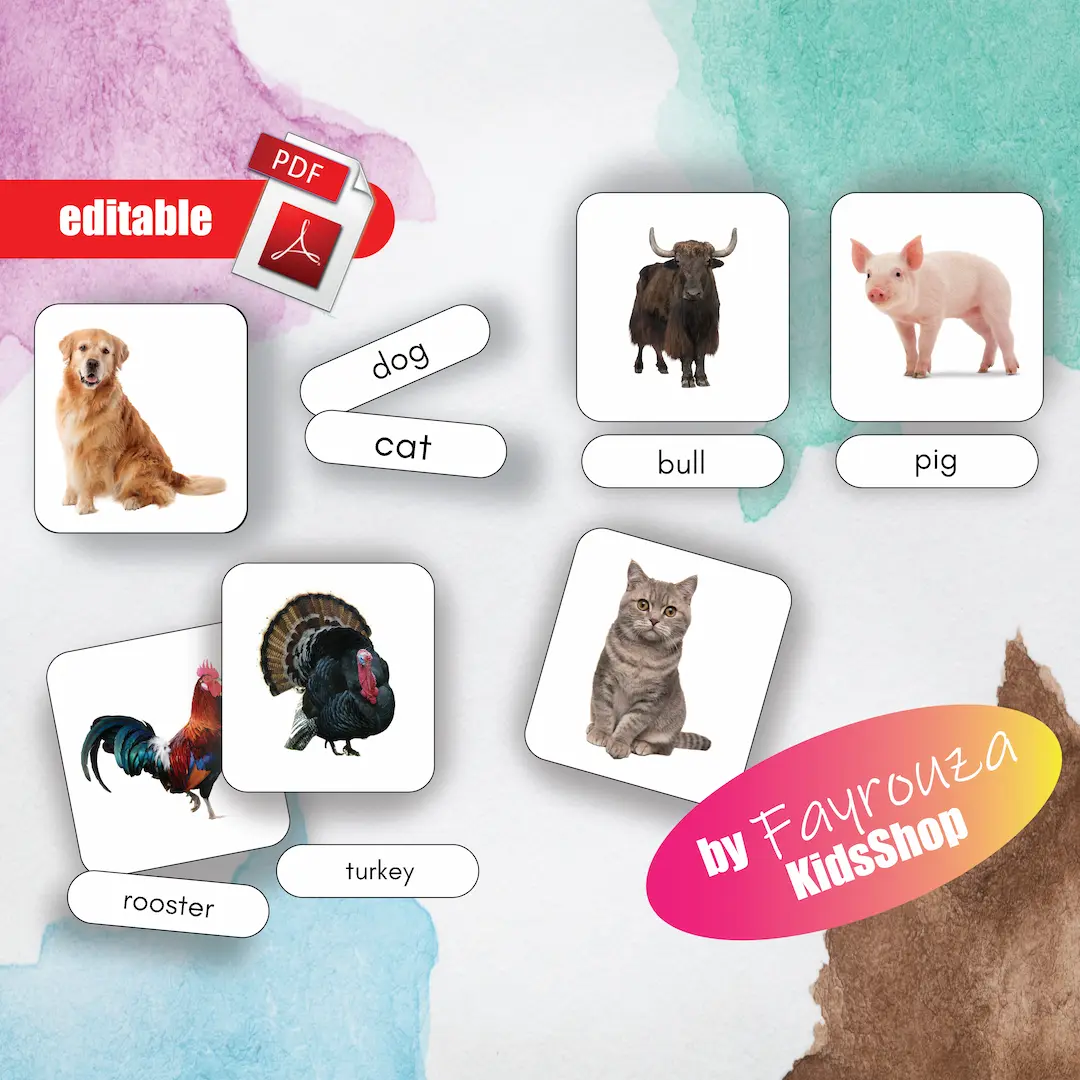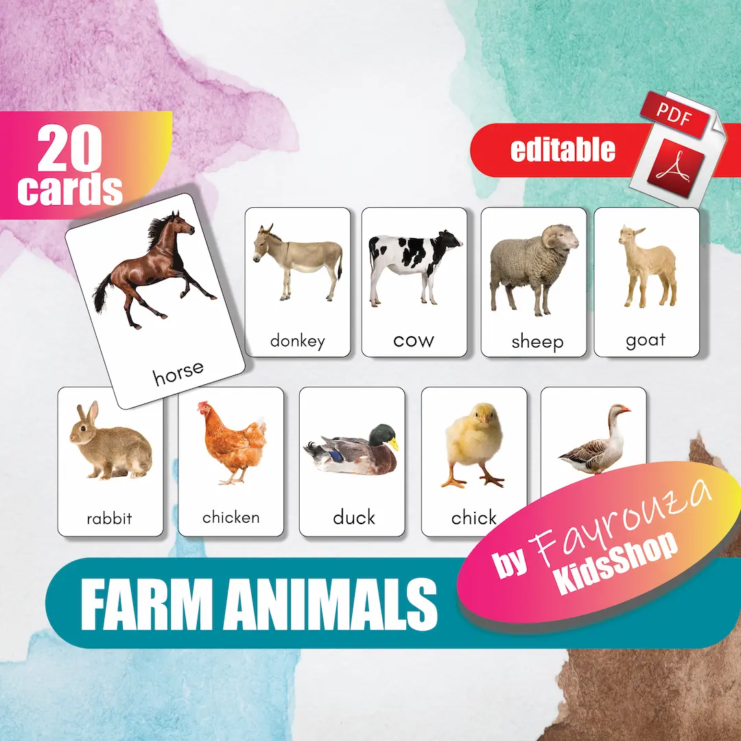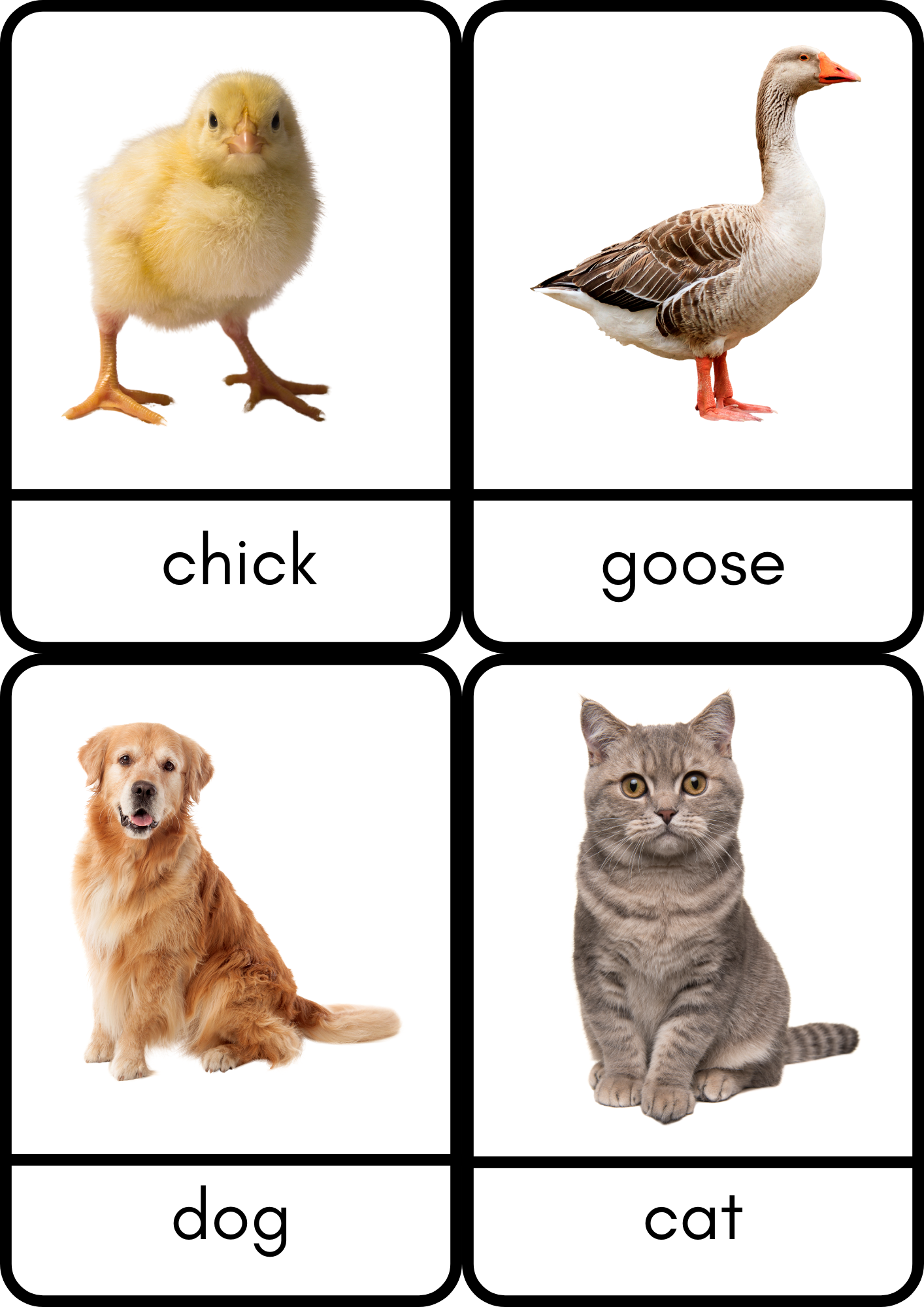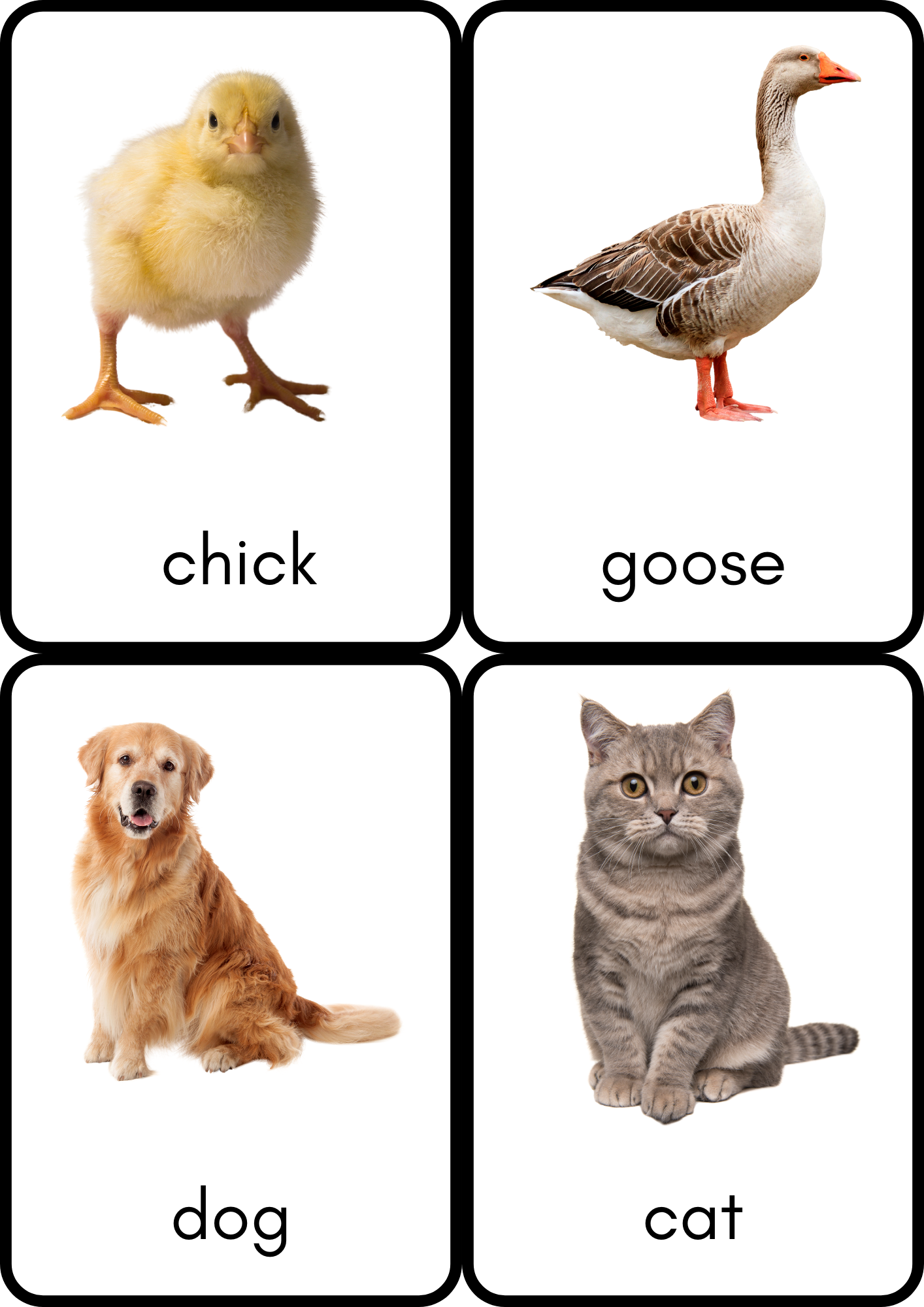 Main card: A card with a picture of a farm animal and its name written clearly underneath.