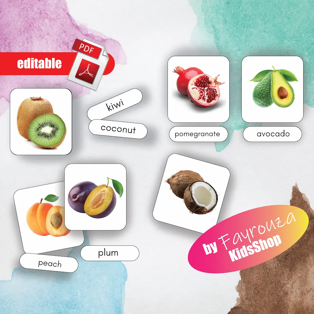 Interactive learning cards that teach fruit names and enhance children’s vocabulary and early reading skills.