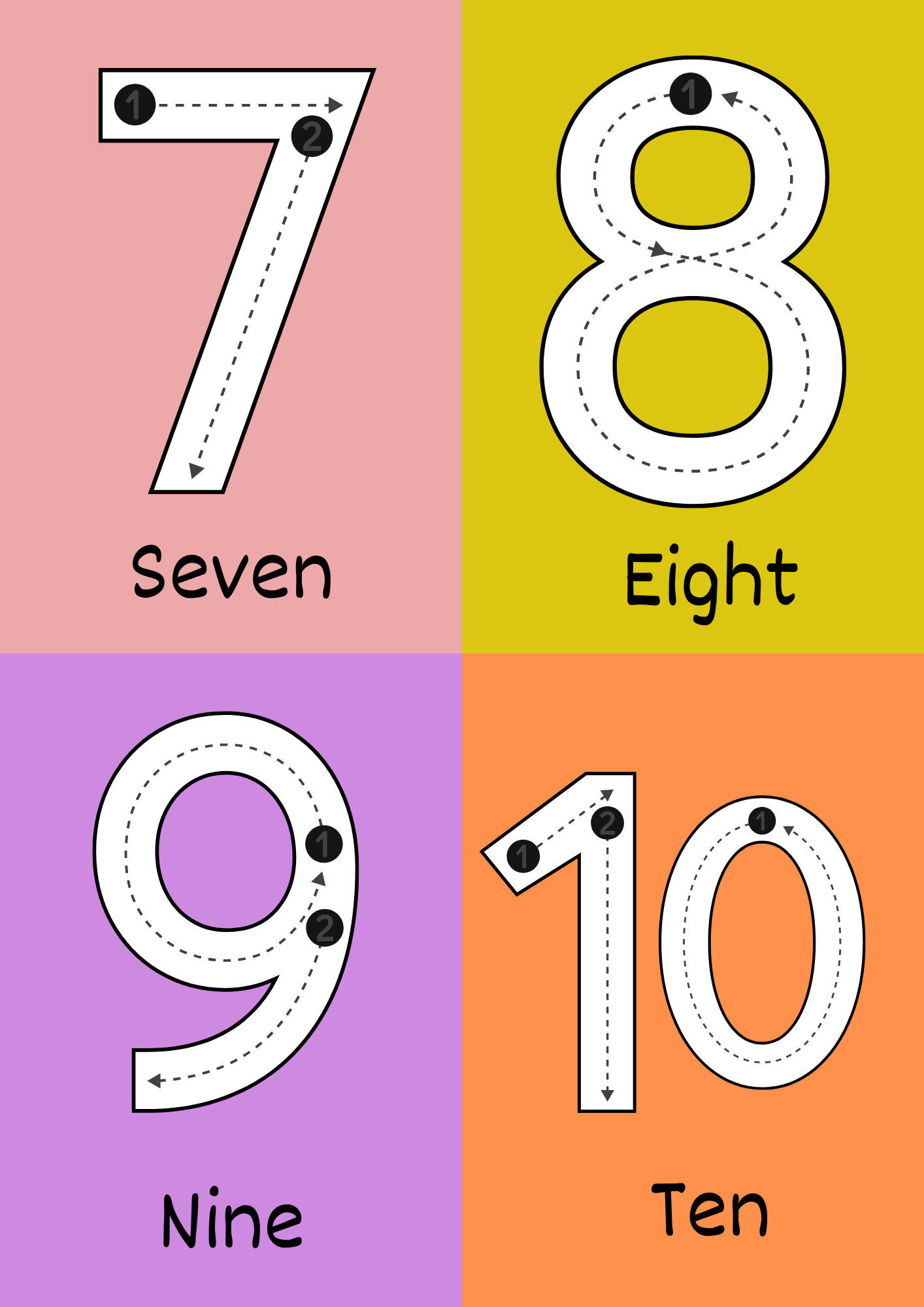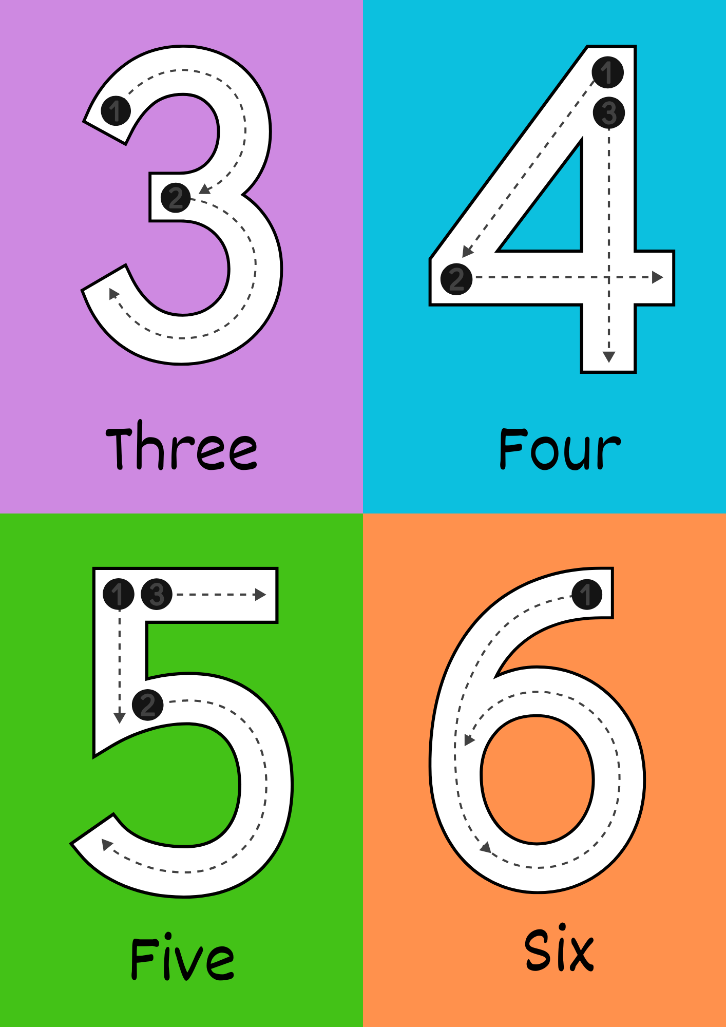 Each large card includes a hollow outline of a shape or number with arrows and directional guides that show the correct tracing path.