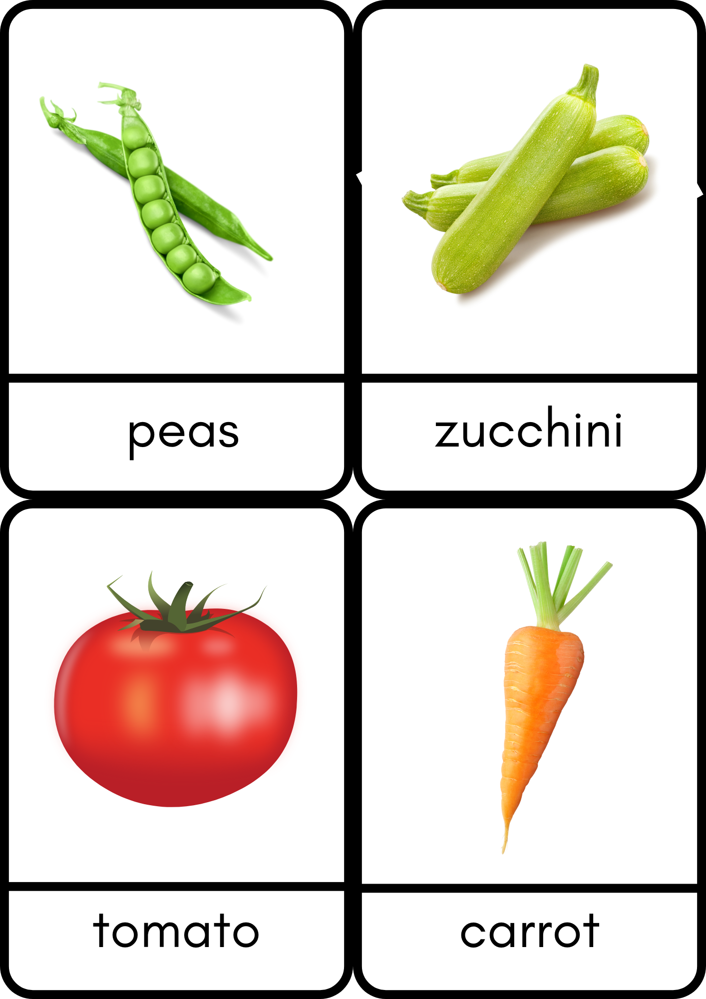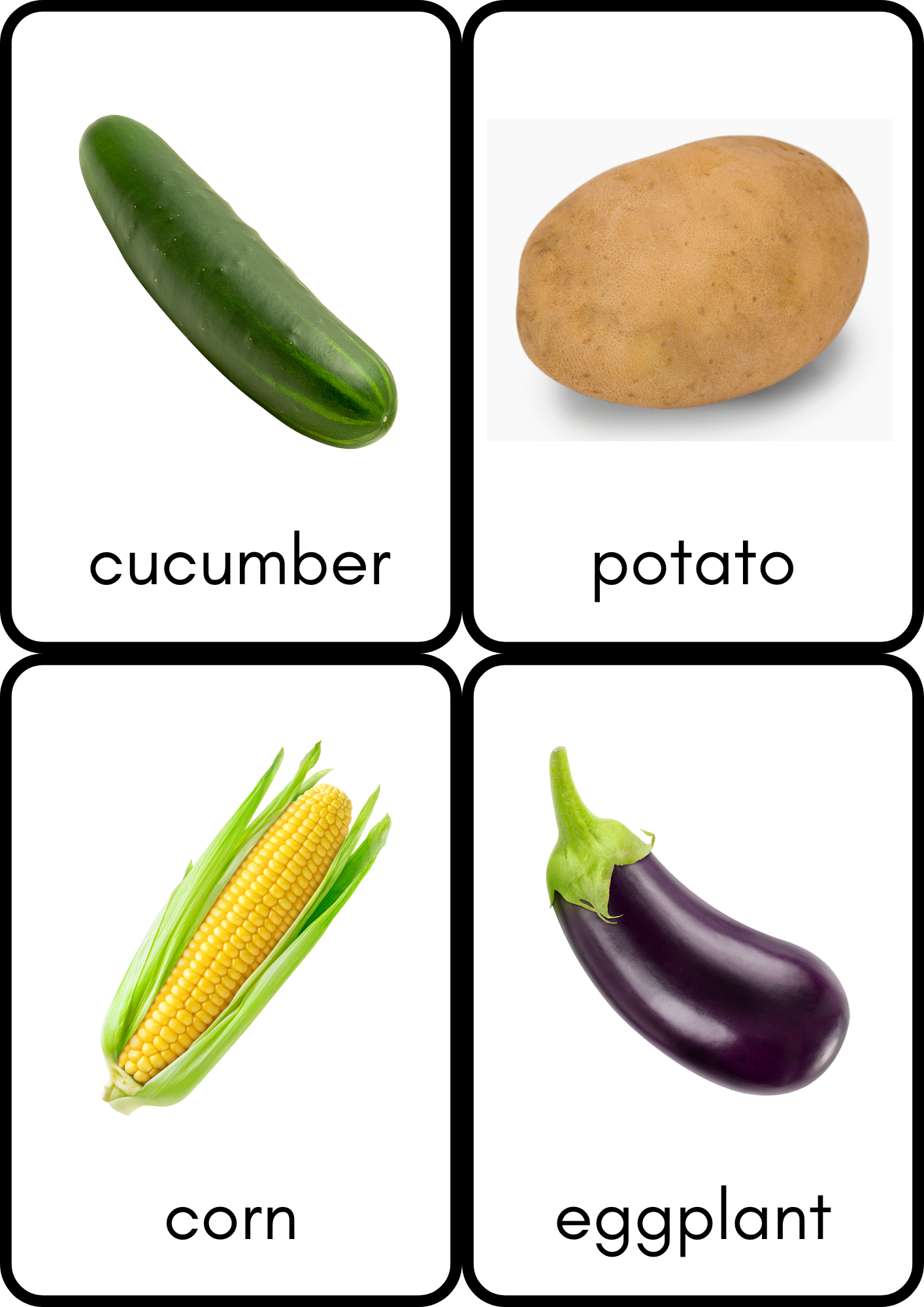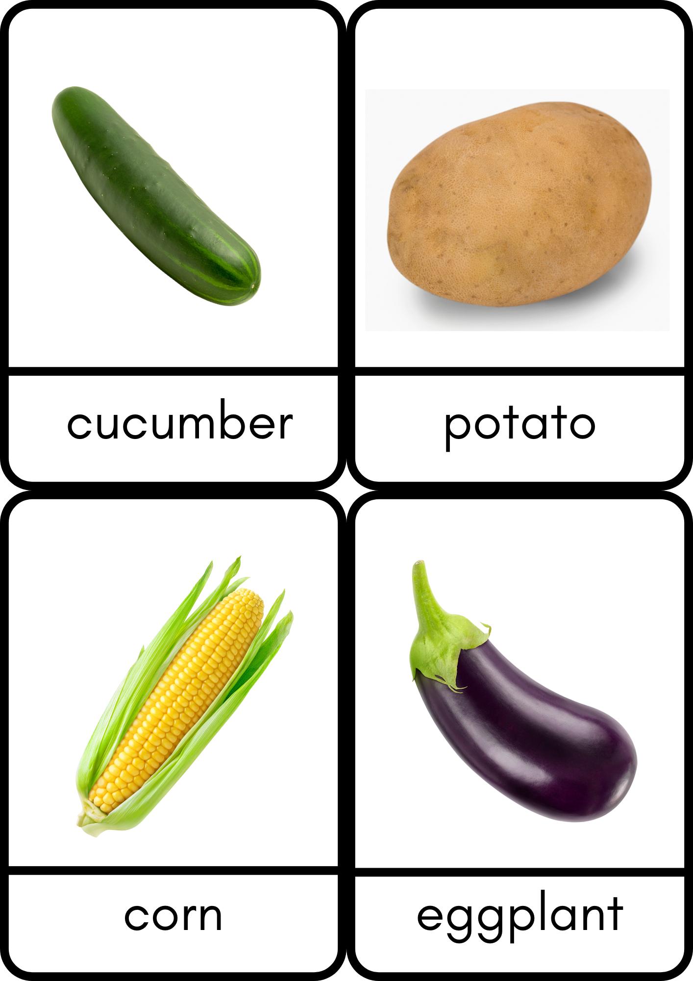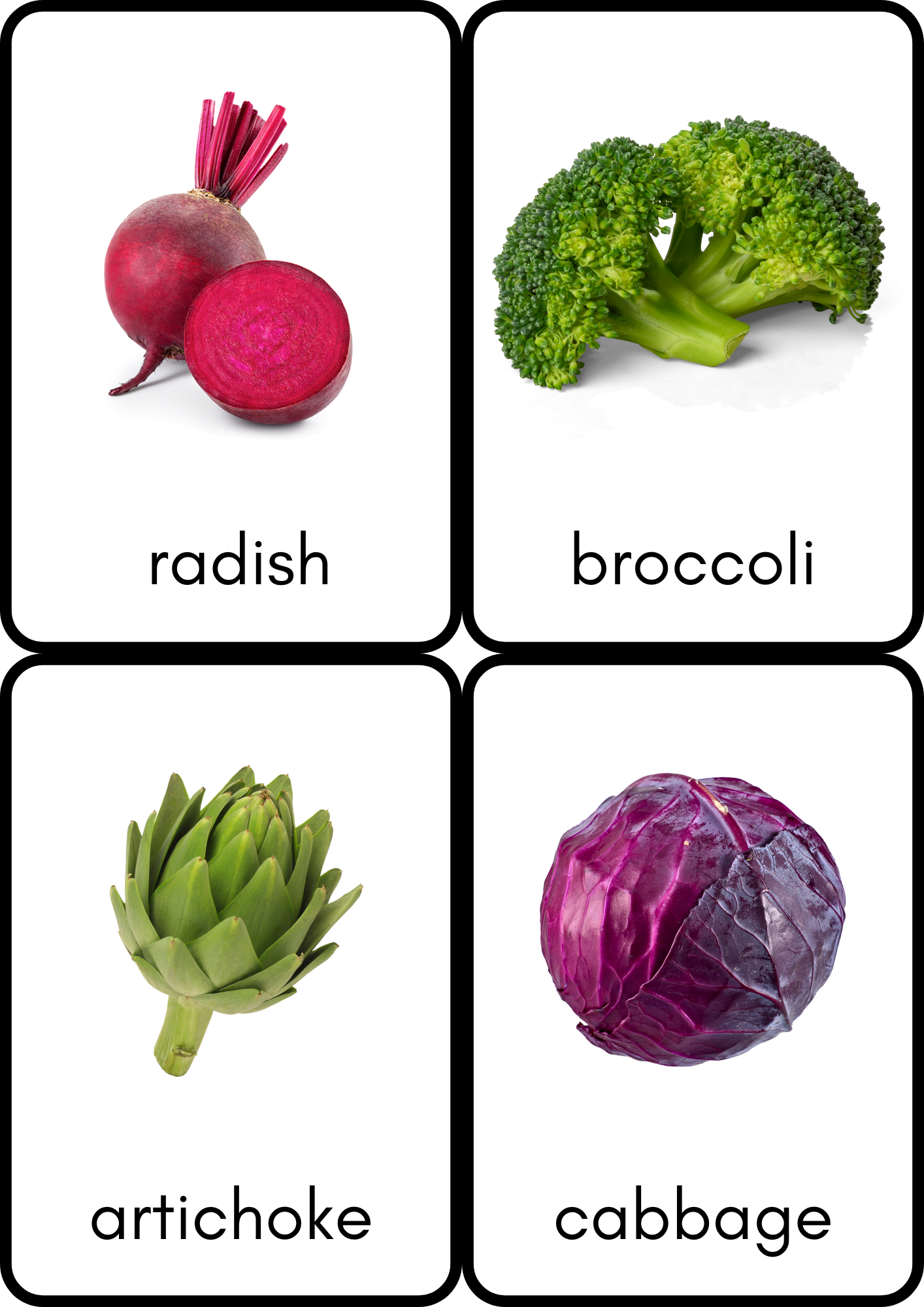 • Main Card: A picture of the vegetable with its name printed underneath.