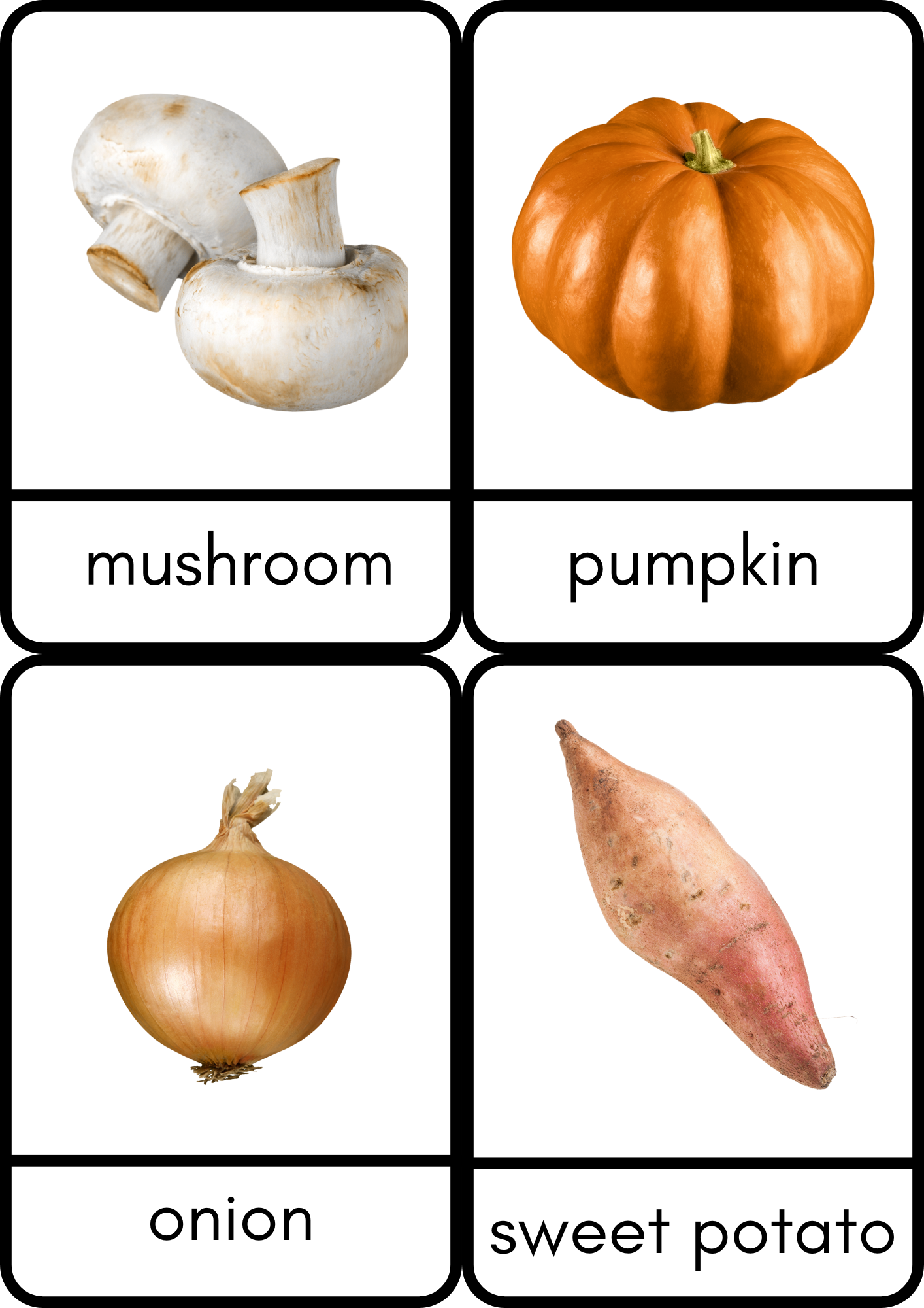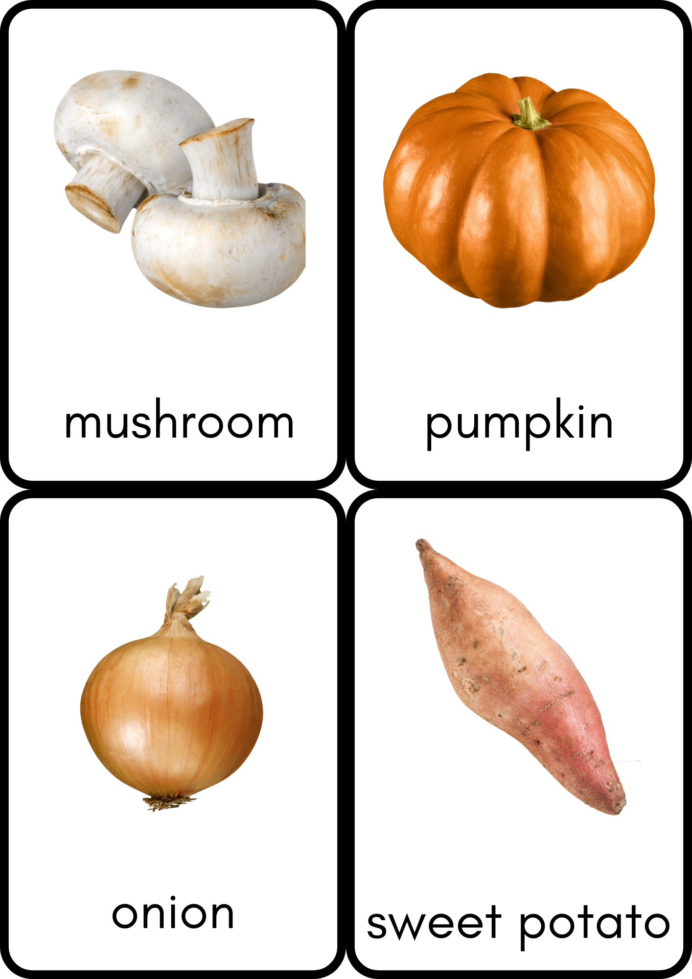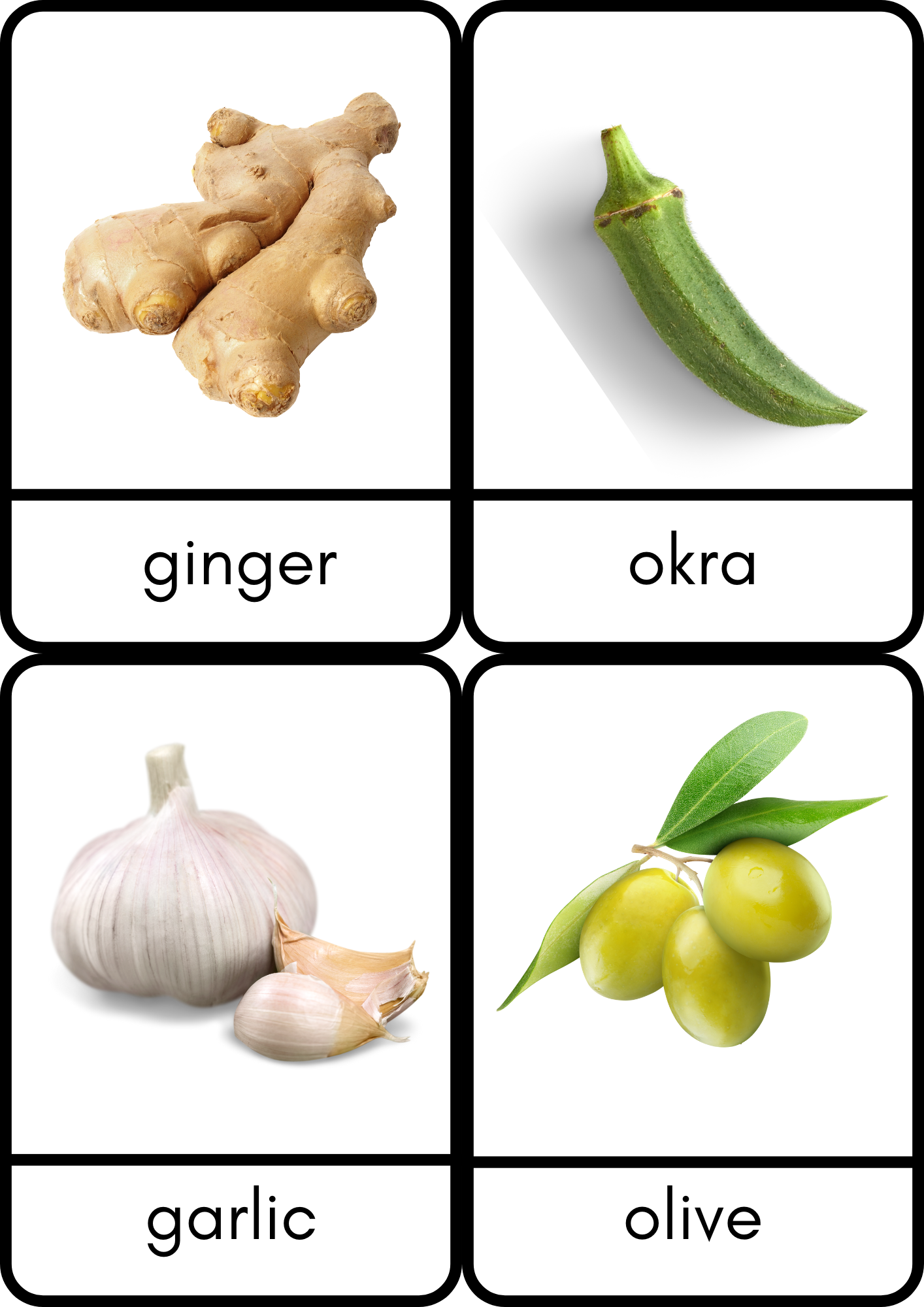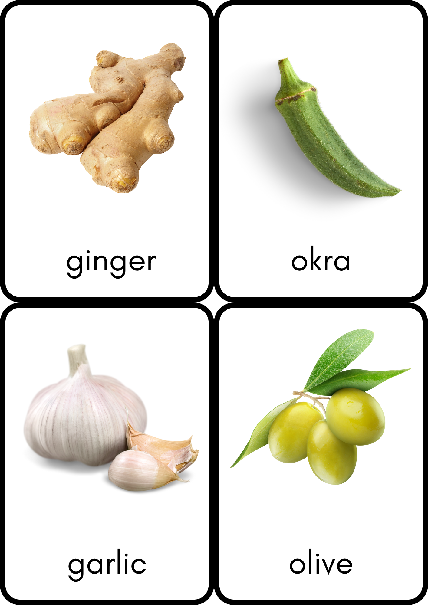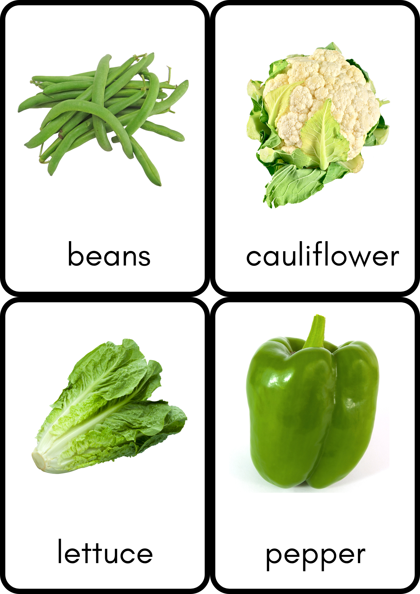 • Main Card: A picture of the vegetable with its name printed underneath.
