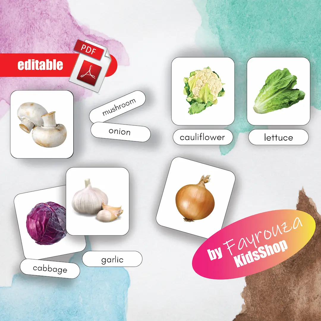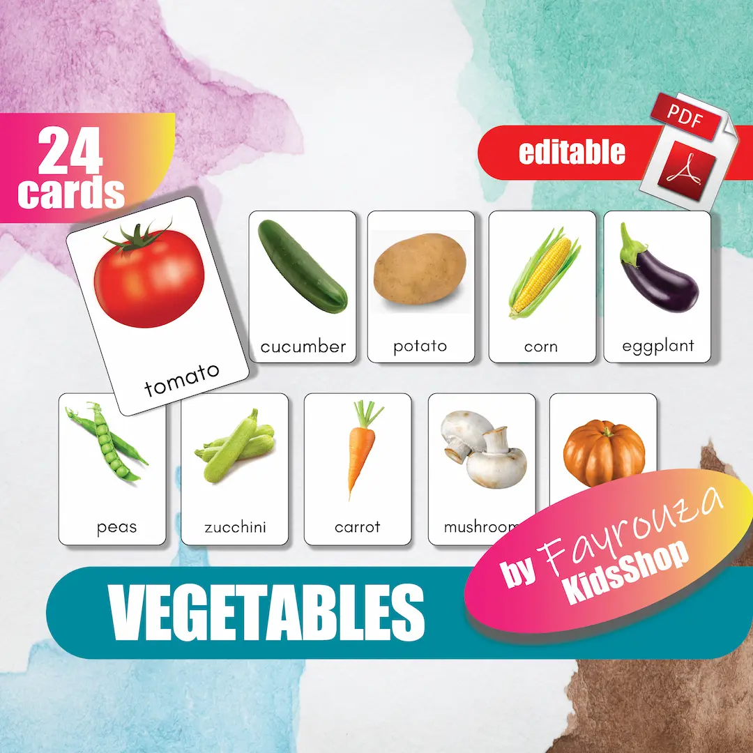Interactive cards that teach kids vegetable names while building vocabulary and early reading confidence.