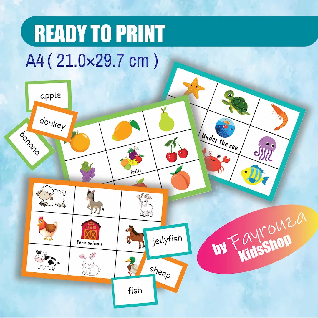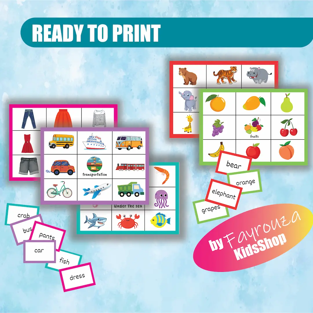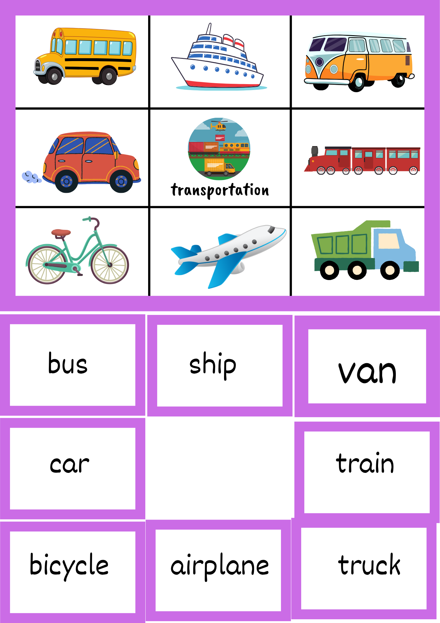 all centered around a common topic or theme (e.g., animals, fruits, transportation, etc.).